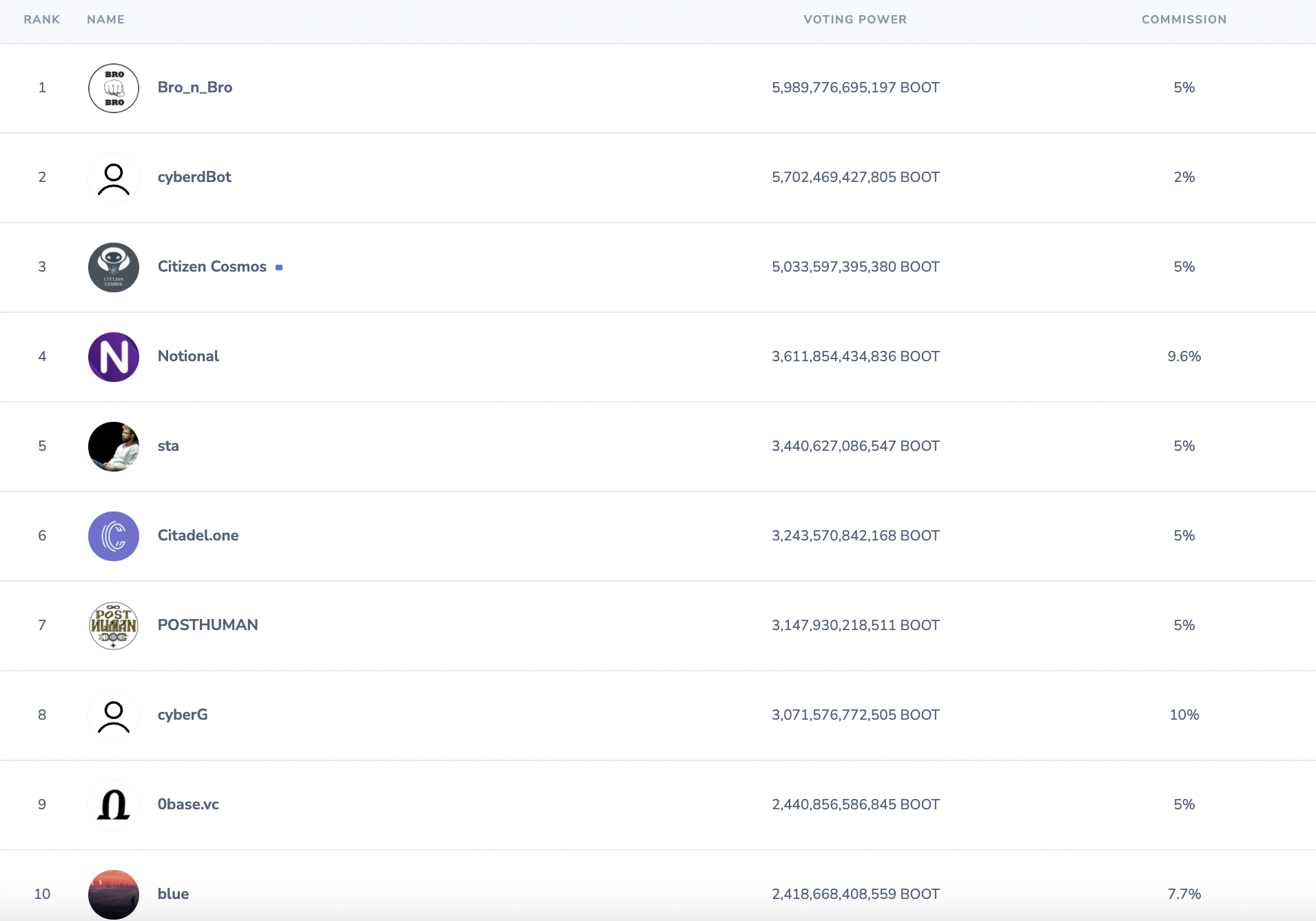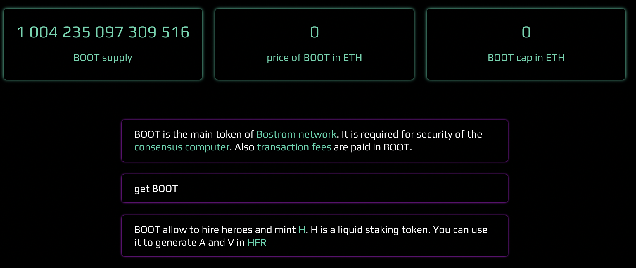 - BOOT는 Bostrom network의 메인토큰이다. (Bostrom은 bootloader의 허브다. 사이버는 infrastructure를 필요로 한다.)