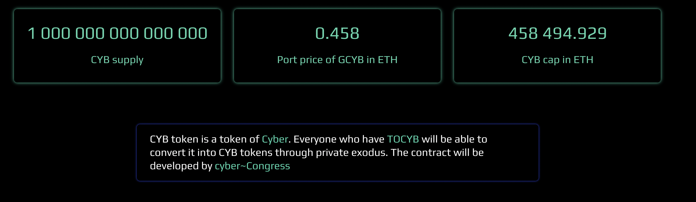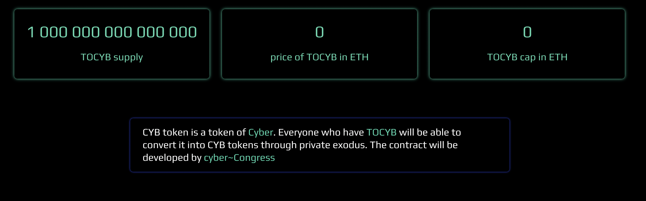 - TOCYB를 보유하고 있는 사람들이 CYB토큰으로 private exodus를 통해서 교환할 수 있다. (향후에 CYB로 교환할 수 있는 컨트랙트가 제공될것으로 보여짐)