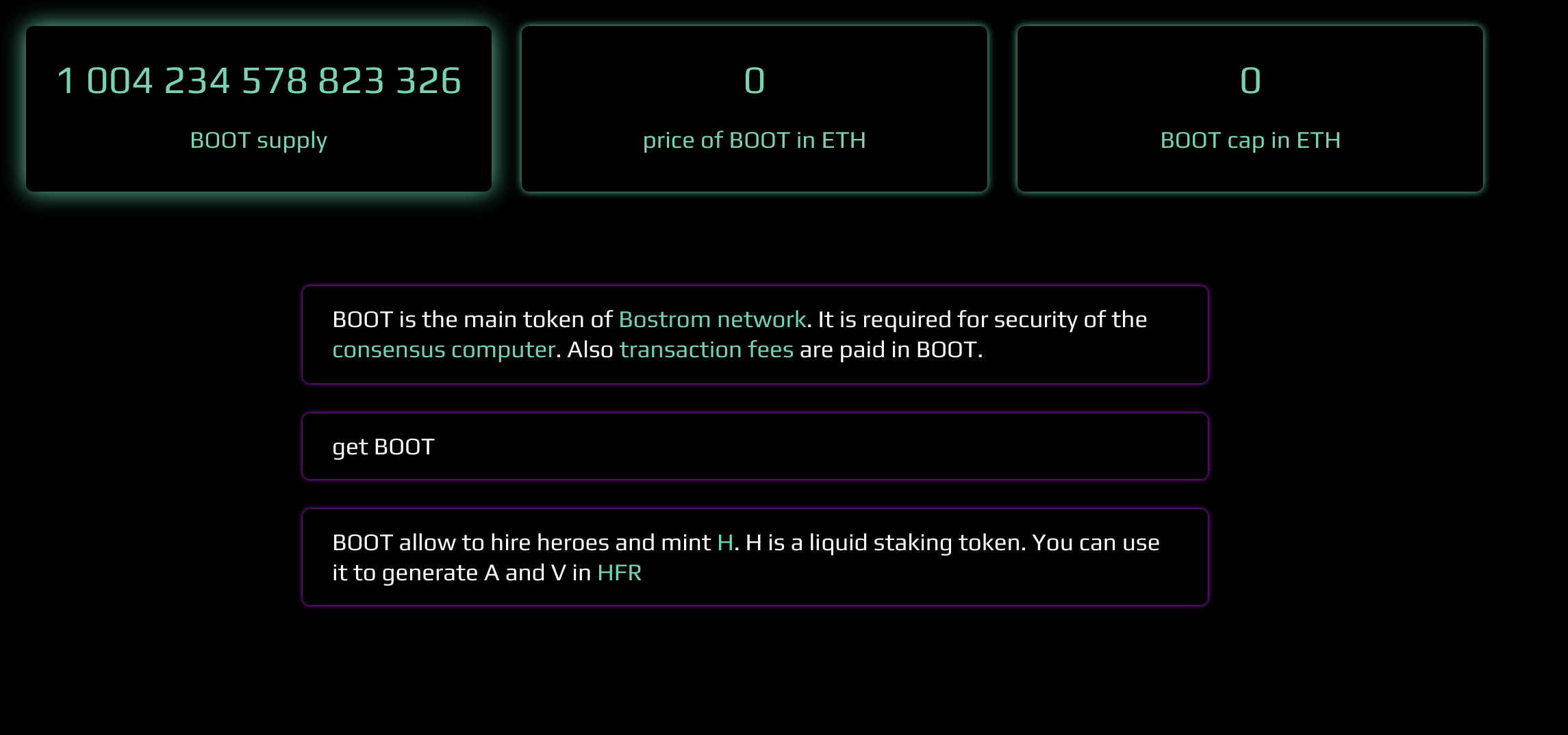 - BOOT는 Bostrom network의 메인토큰이다. (Bostrom은 bootloader의 허브다. 사이버는 infrastructure를 필요로 한다.)