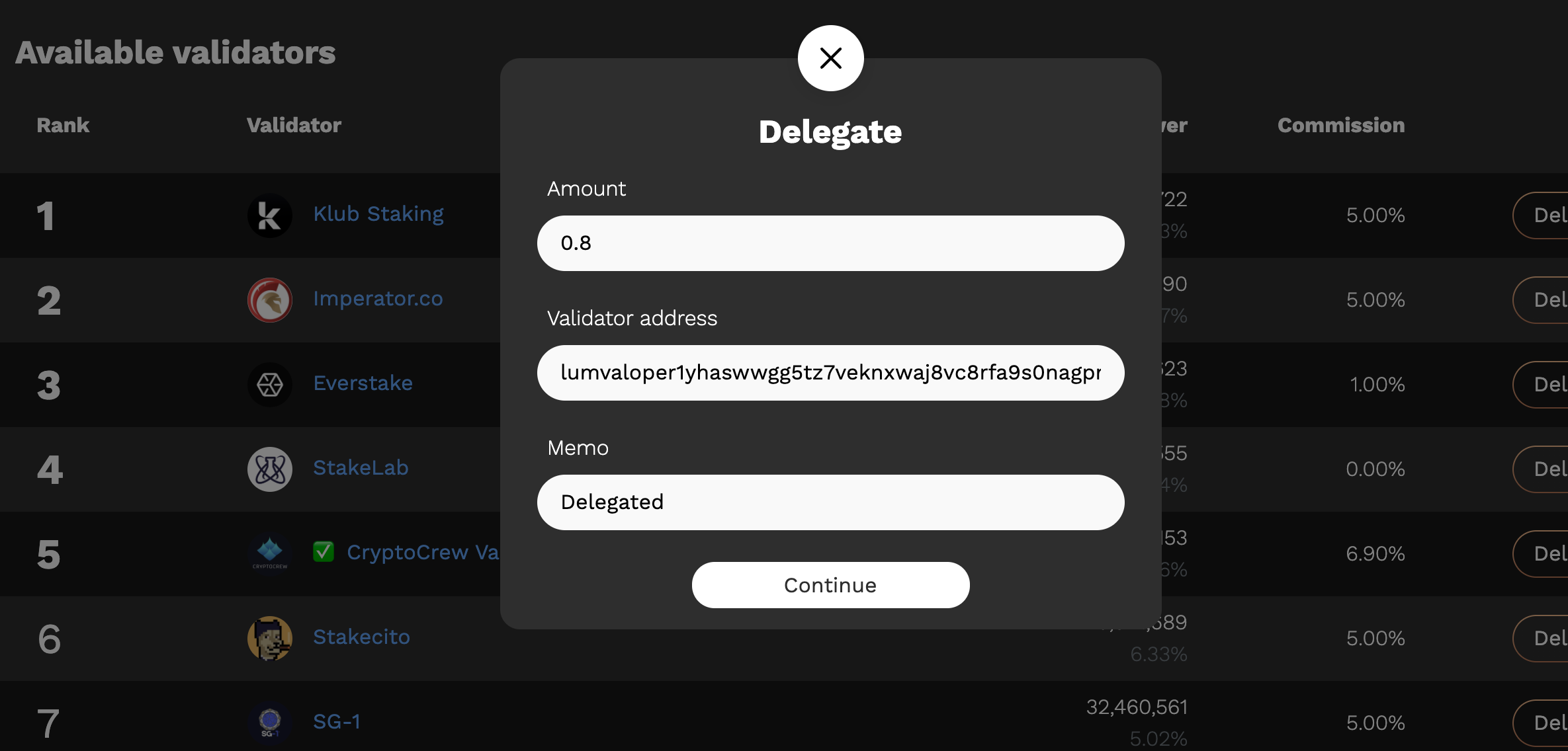 - 아래 사이트에서 검증인을 선택 후 스테이킹 하면 됩니다.