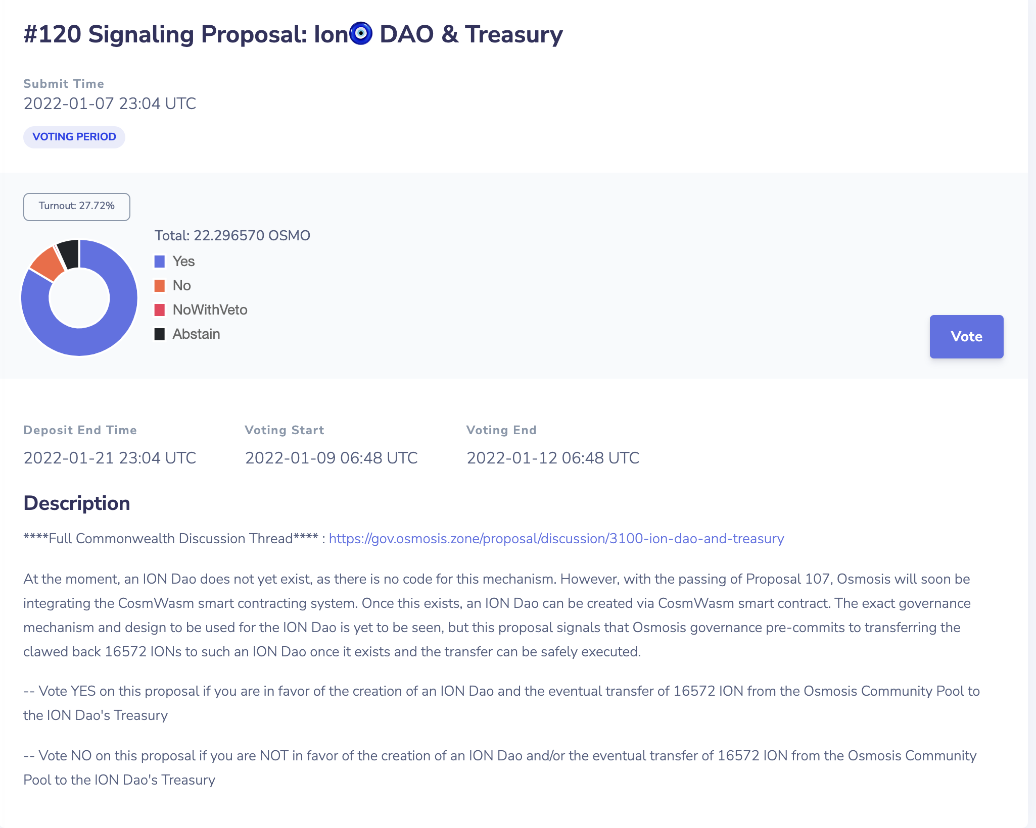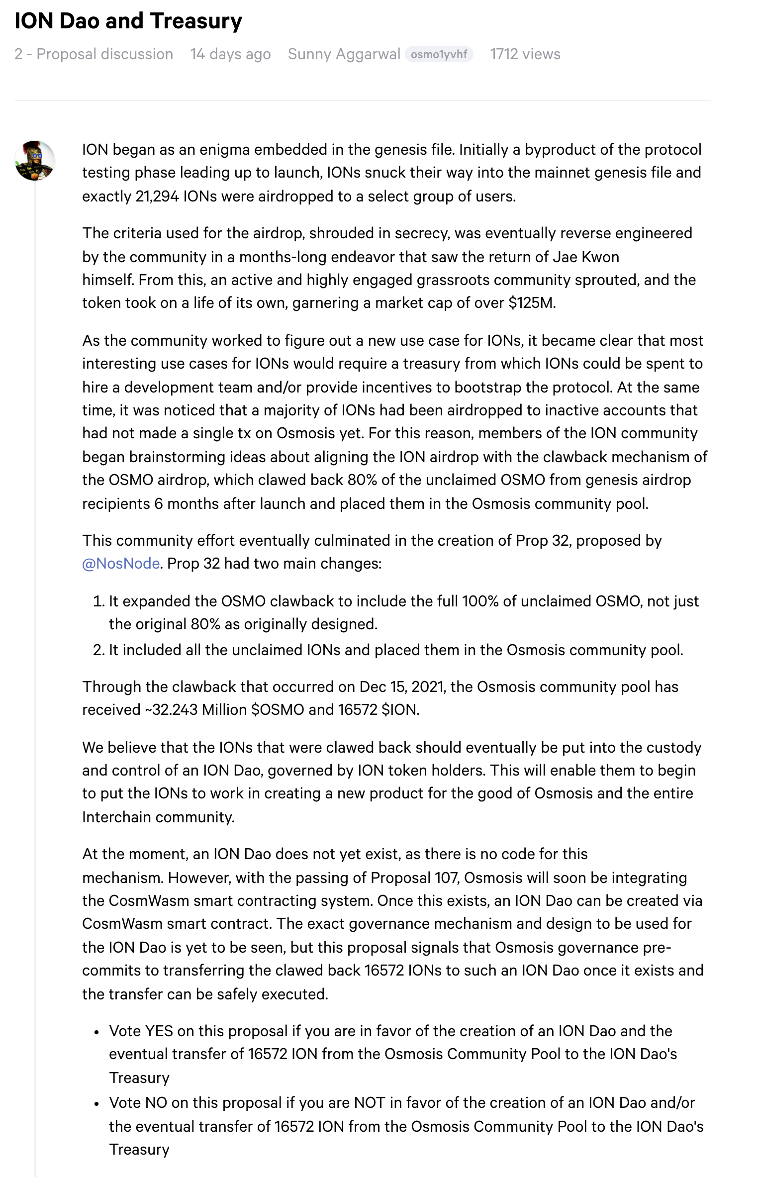 오스모시스 파운더 Sunny가 제안한 프로포절(https://gov.osmosis.zone/discussion/3100-ion-dao-and-treasury)의 내용이다.