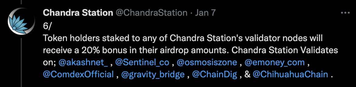 - 대상 : 아카시, 센티널, 오스모, 이머니, 컴덱스, 그래비티브릿지, DIG, 치와와에 찬드라 스테이션을 검증인으로 선택한 위임자.