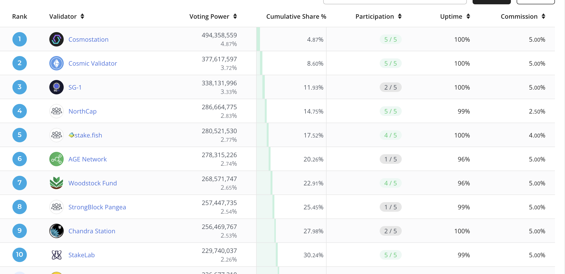1. 검증인 순위 및 참여하고 있는 코스모스 생태계