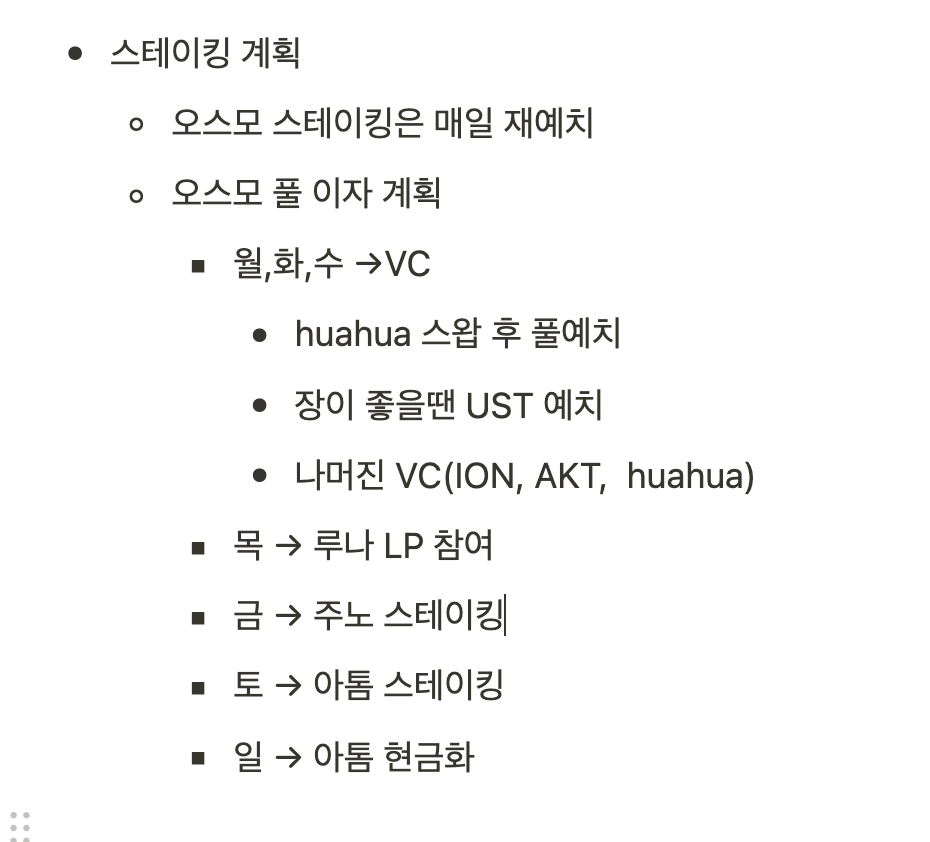 오스모시스 풀에 참여하여 발생한 이자는 위 계획처럼 활용한다. 월,화,수는 VC같은 마인드로 새롭고 참신한 코스모스 생태계에서의 신규 프로젝트들에 참여한다. 계획은 계속 수정되지만..현재시점에서는 주로 치와와에 재투자하거나 장이 좋을땐 일부 UST로 교환한다. 그리고 ION 및 AKT 등에 조금씩 투자중이다.