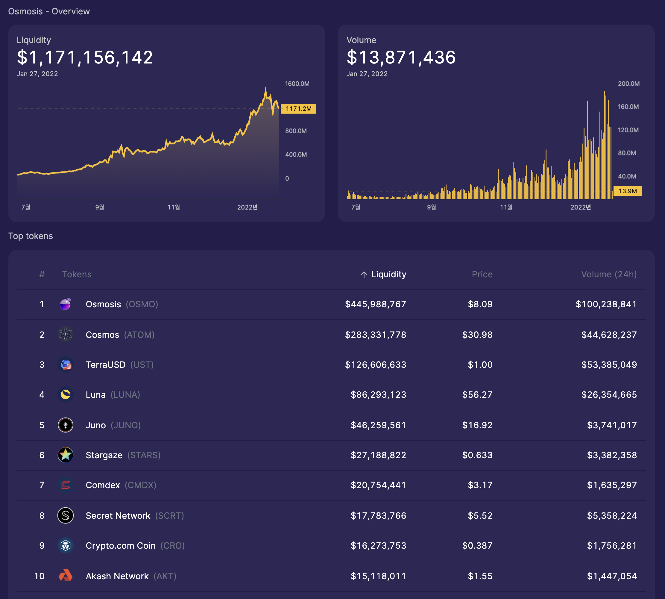 - 오스모시스에서 보면, 22년 1월 27일 기준 일 거래량 볼륨이 3.3M 달러(원화로 약 40억정도) 오스모시스에서는 거래량이 6위정도 된다.