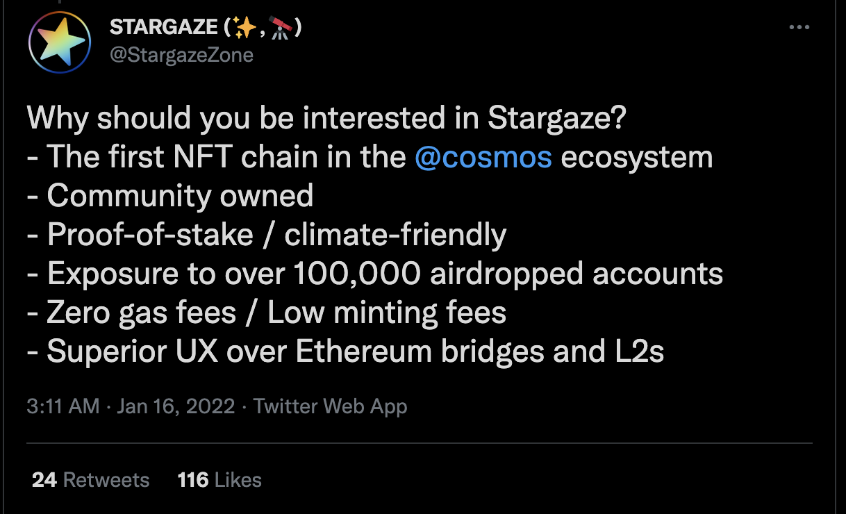 - 이러한 관점에서 살펴볼때, 스타게이즈는 코스모스 생태계에서 첫번째 NFT 프로젝트다. 그리고 오픈씨와 같은 플랫폼이며 NFT를 활용한 다양한 금융상품들들이 최근에 출시되고 있는 시점에서 이러한 측면도 프로젝트 방향에 나와 있다.
