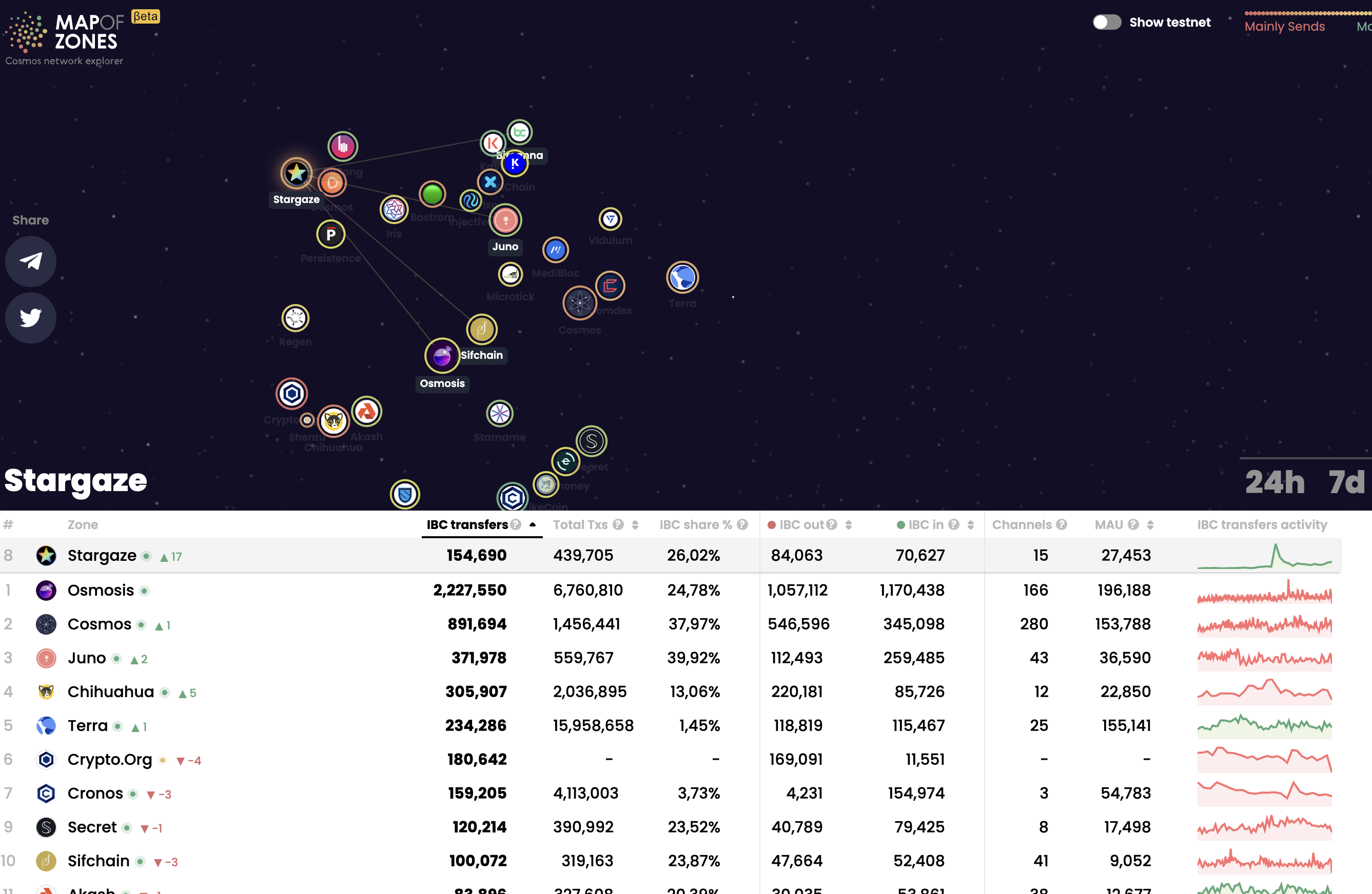 - 최근 1달 기준 스타게이즈는 전체 IBC 트랜잭션 순위에서 8위다.