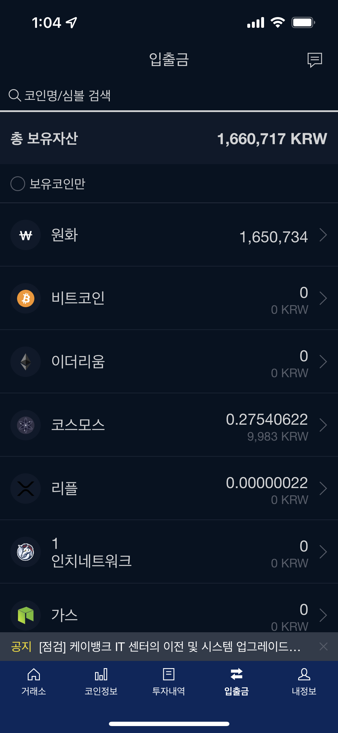 이제 업비트에서 아톰을 구매하여 방금 만든 코스모스테이션에 있는 지갑 주소로 보내고, 이걸 오스모로 교환 후에 스테이킹하면 된다!!