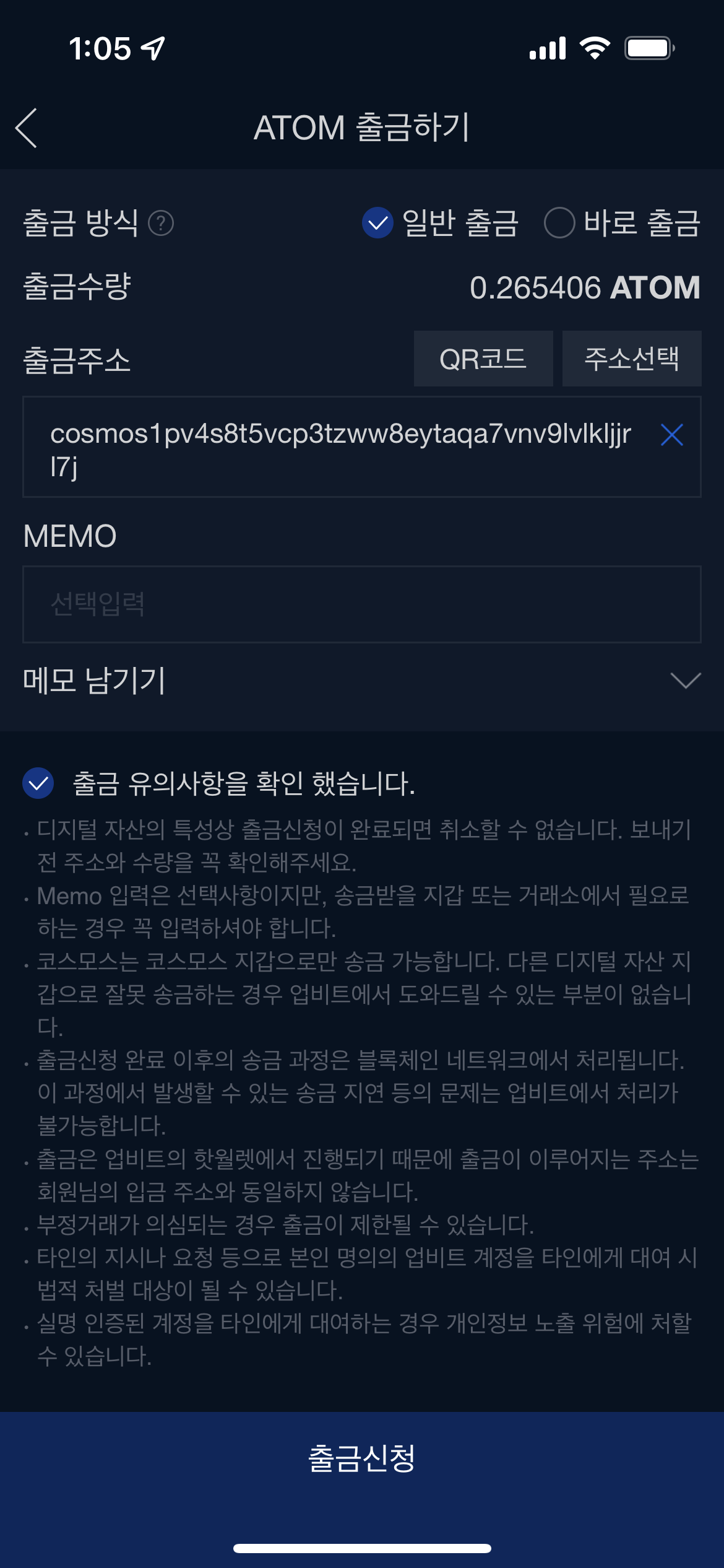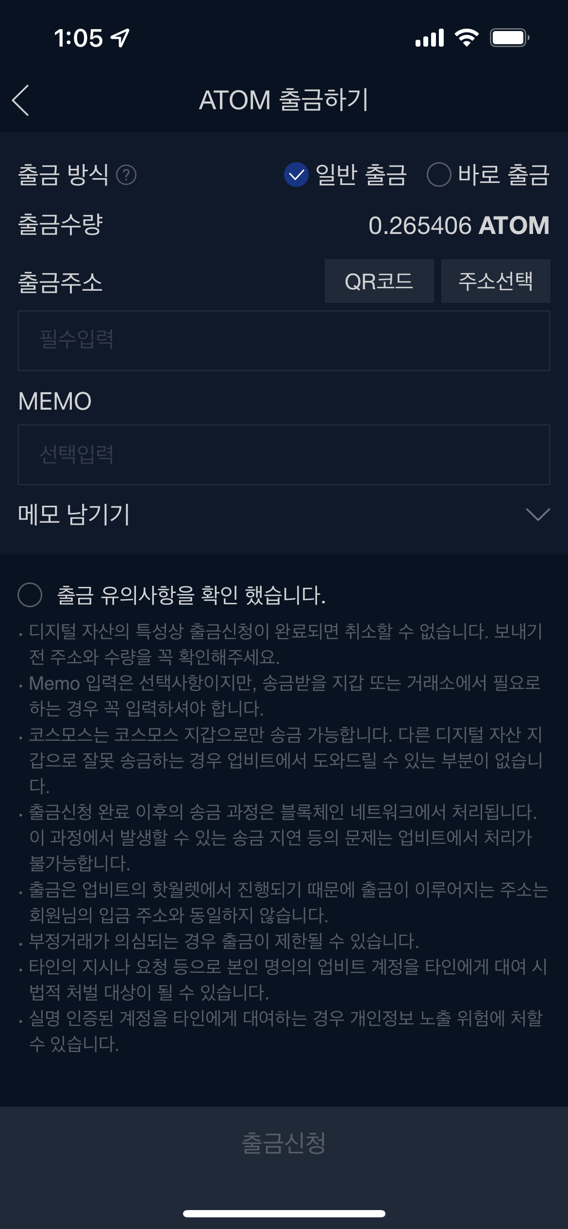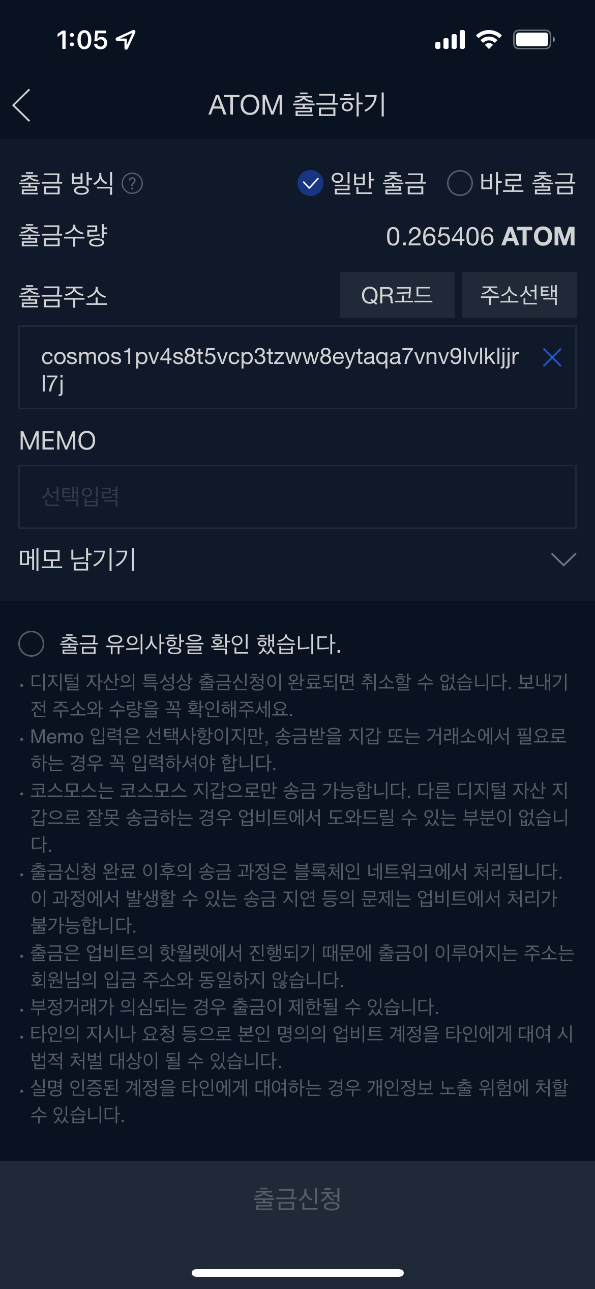 5.10출금신청 - 주소를 확인하였으면 출금 유의사항 확인 후 출금신청