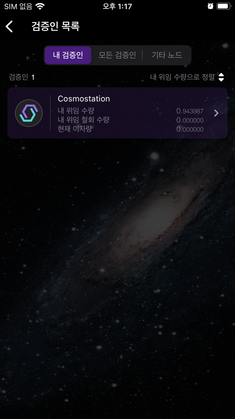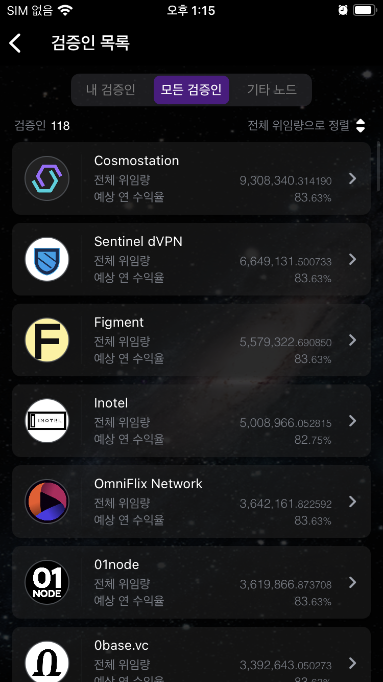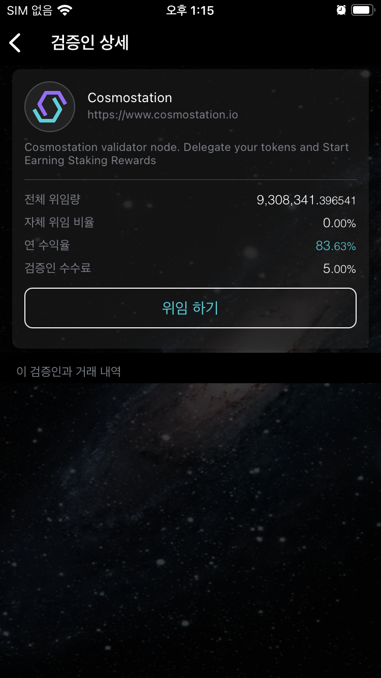 암튼, 그렇게 하기 위해서 검증인을 선택해야한다. 향후에 공부해보기로 하고 이번엔 제일 상단에 코스모스테이션을 선택하자! 지금 사용하고 있는 이 지갑, 코스모스테이션을 만든곳이 이곳이다. 참고로 검증인을 잘못선택하면 나의 토큰이 삭감될 수 있다는 정책이 있다는걸 알아둬야 한다. (참고로 상위 10위 검증인 중에 이런일은 잘 일어나지 않는다!!)