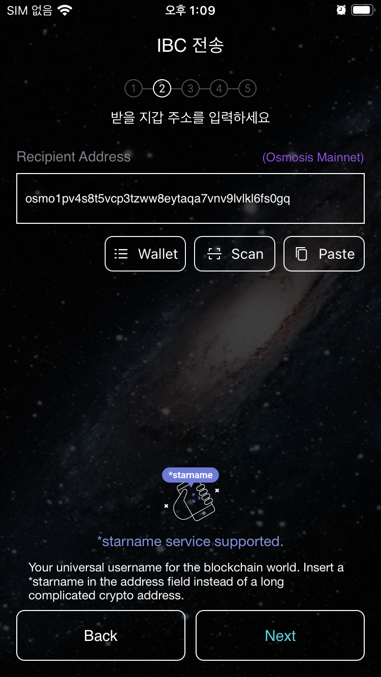 6.8 선택을 하면 아래에 오스모시스 지갑주소가 자동으로 입력이 된다. Next를 누른다.