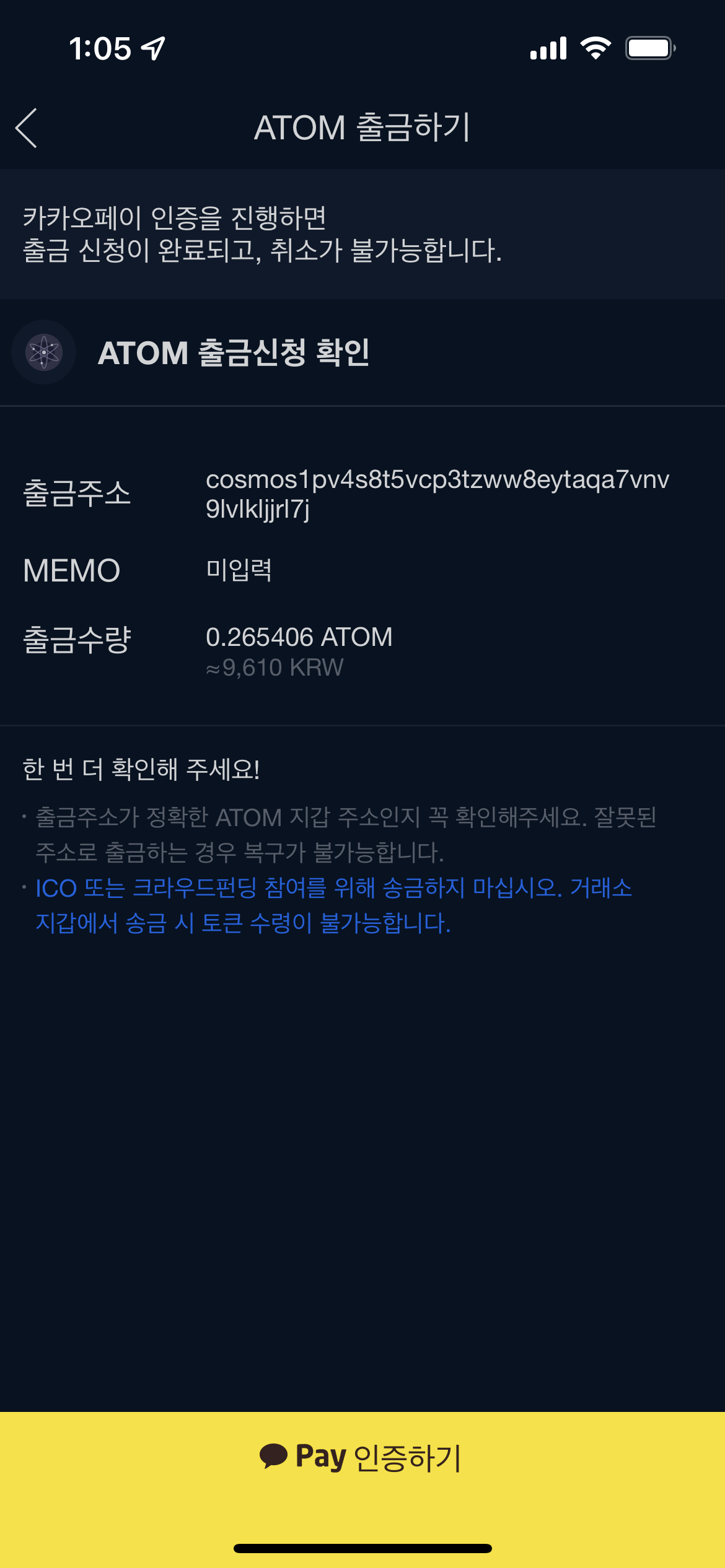 5.12 ATOM 출금하기 후 카카오 인증하면 ATOM이 전송된다!!!
