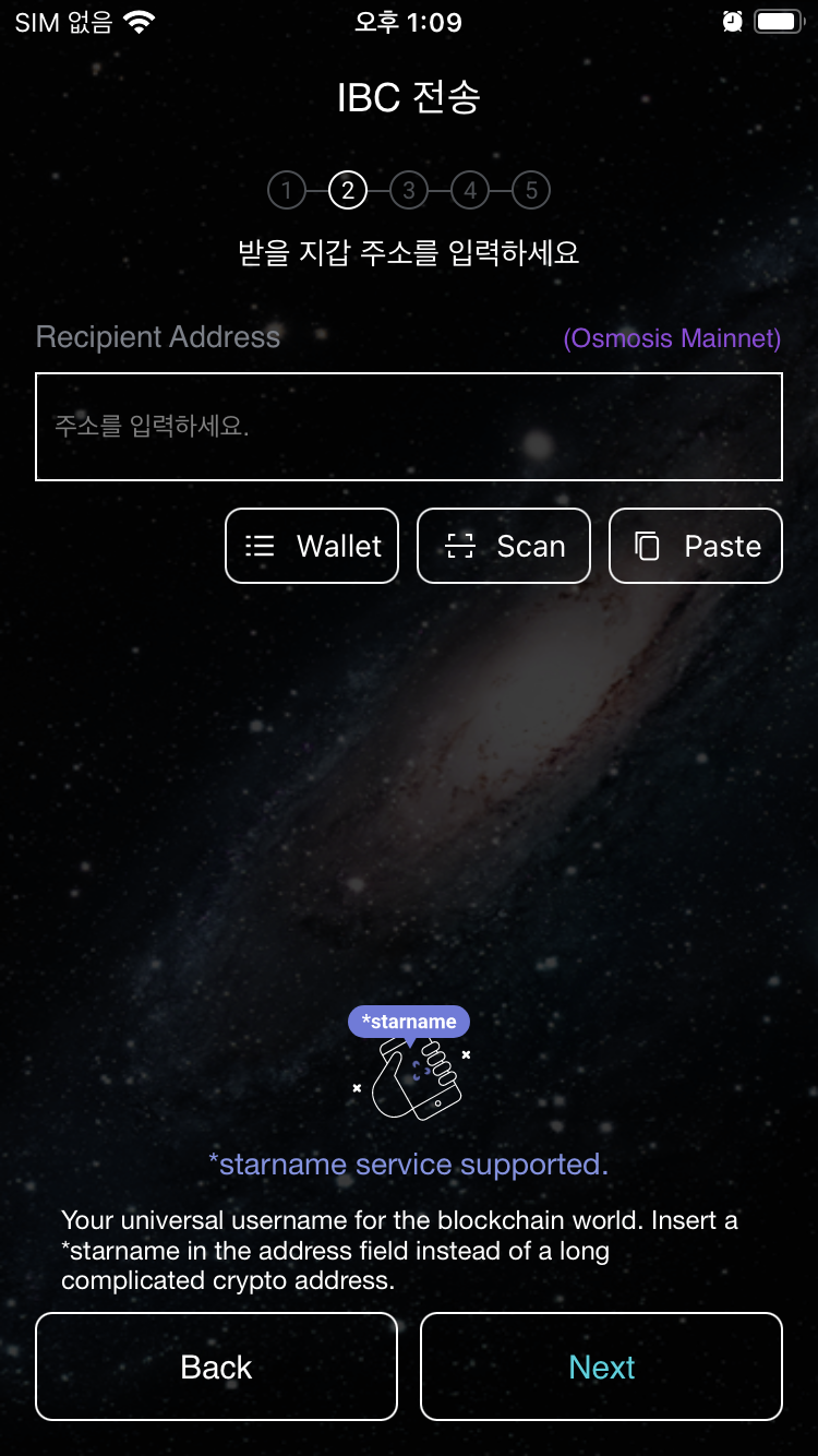 6.6 IBC 전송화면이 뜬다. 주소입력에 아래에 Wallet을 선택한다.