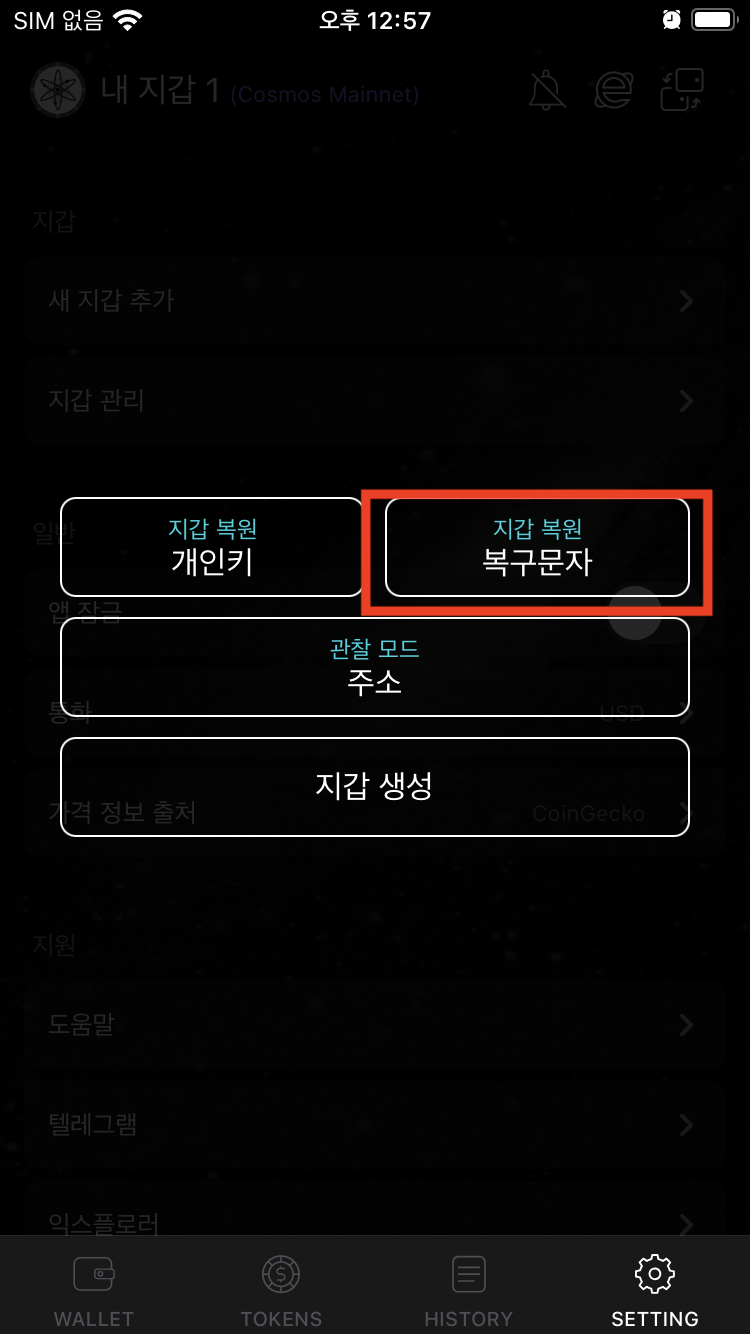 이 니모닉키를 가지고 코스모스테이션에서 오스모시스 지갑을 만듭니다.