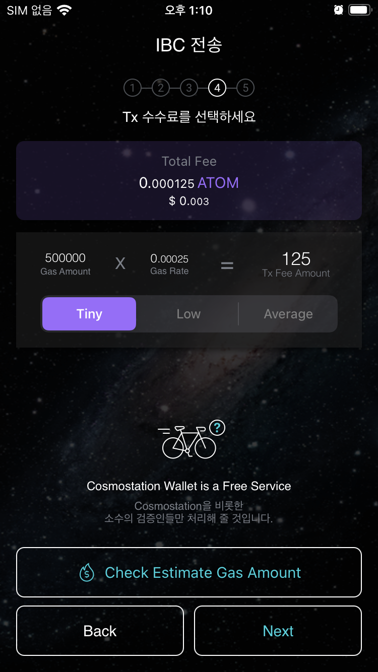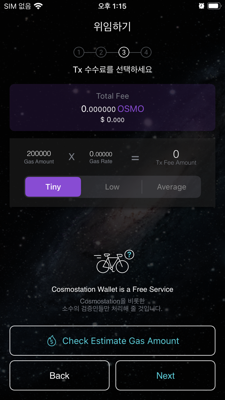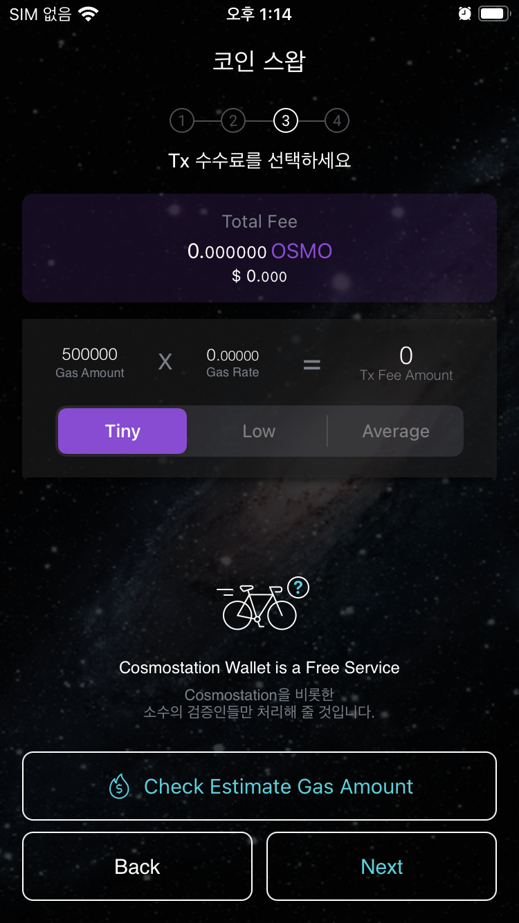 7.8 트랜잭션 수수료를 Tiny로 선택한다. (현재는 오스모시스 사용수수료는 무료다. 언제 종료될진 모름!!)