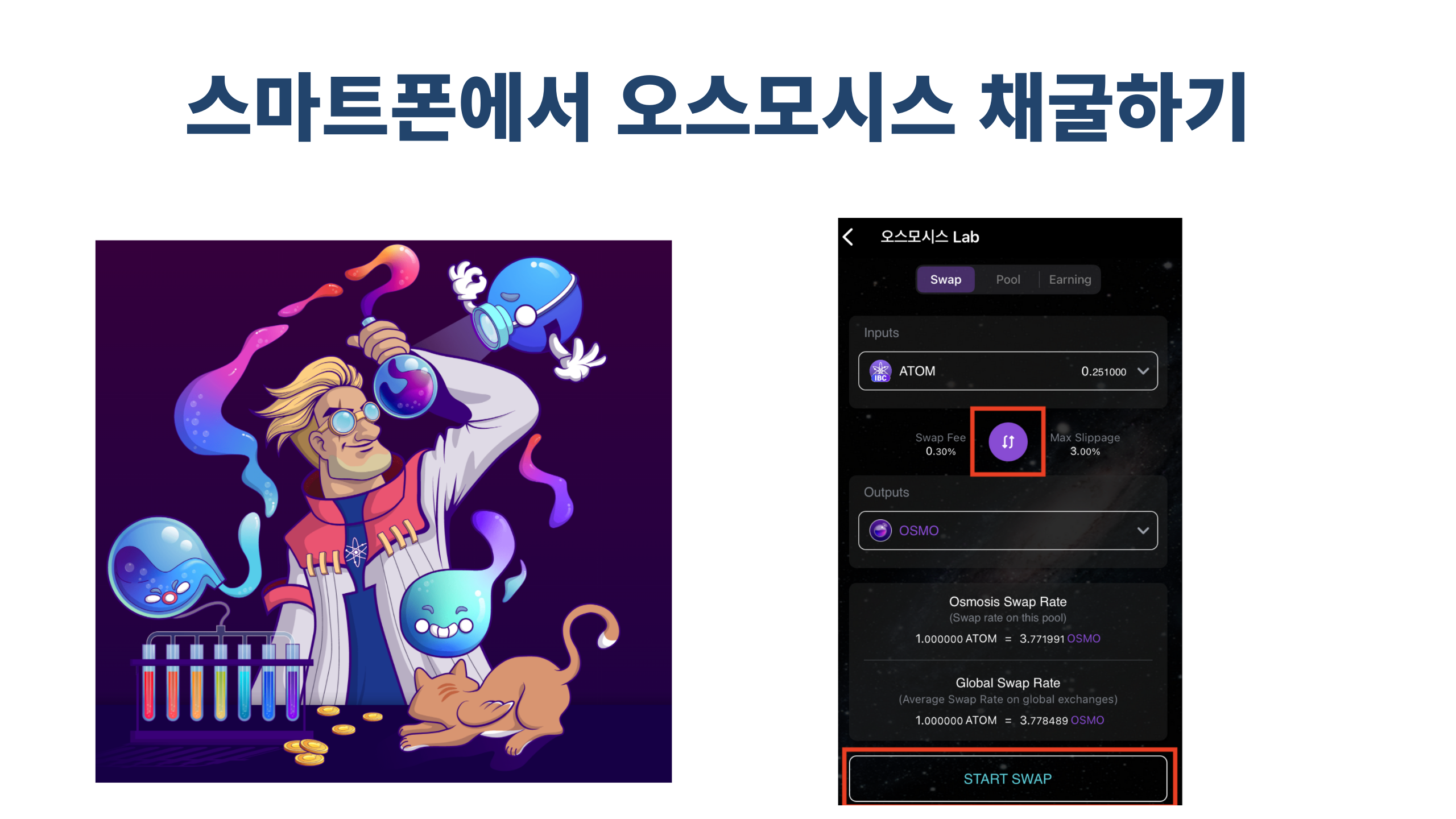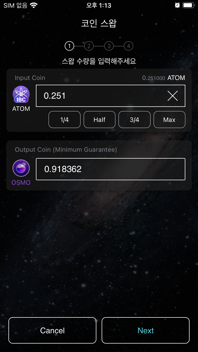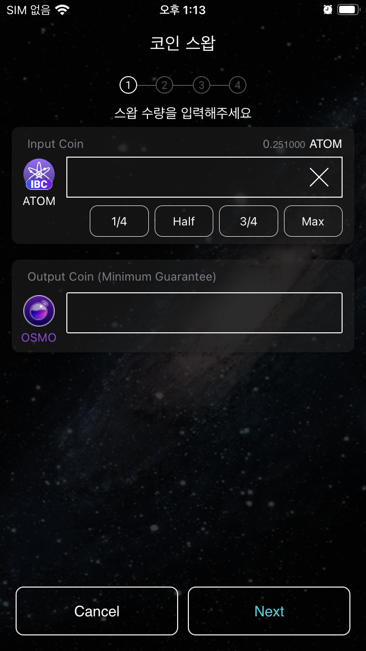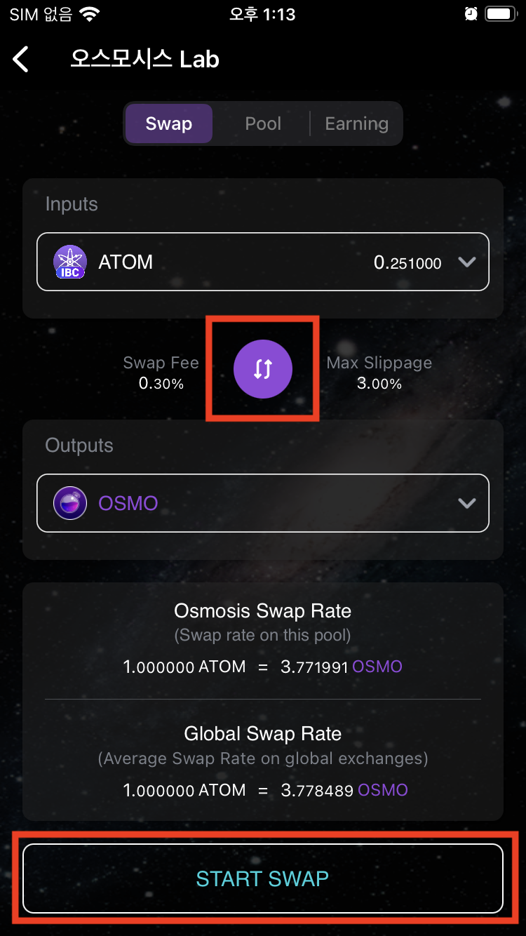 7.4 Swap에서 아래 가운데 스왑 아이콘을 클릭하여 Inputs에 ATOM 을 선택. 그리고 Start Swap