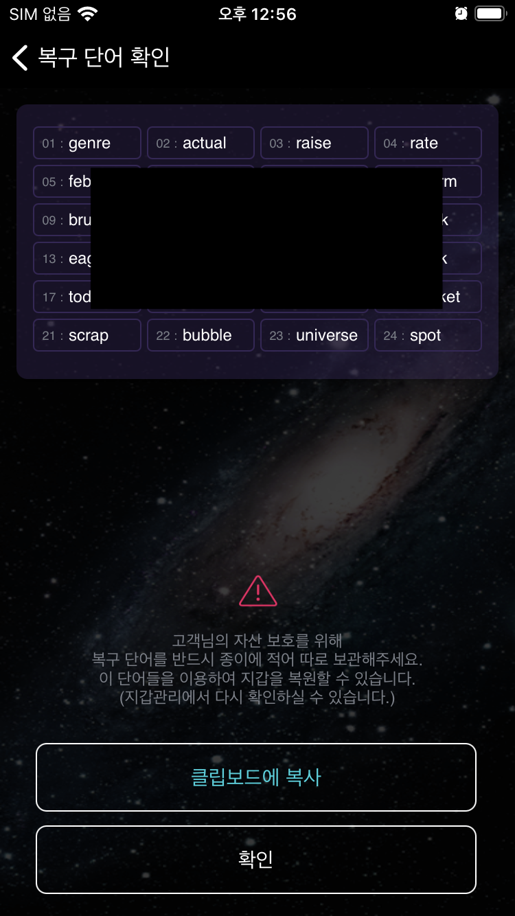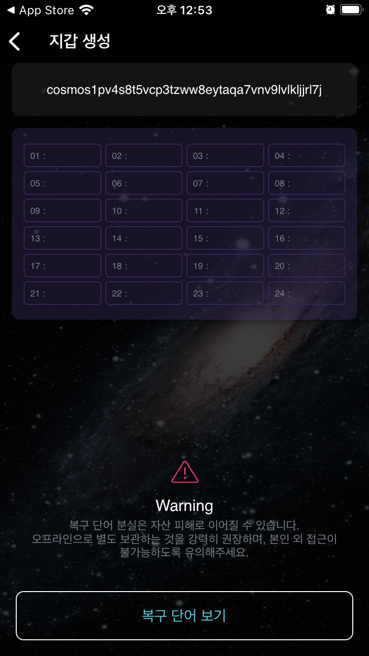 2.5 아래와 같이 복구단어가 보인다. 이게 니모닉이라고 하는건데, 이걸 절대 화면캡쳐하거나 모바일에 저장하거나 PC에 저장하거나 하면 절대절대 안된다!!. 이 니모닉단어 24개를 노트에 잘 적어놓고 금고가 있다면 금고같은곳에 잘 보관해두어야 한다. 이 니모닉 단어를 잃어버리면 아무도 절대적으로 여기에 있는 아톰이나 오스모 등을 찾을 수 없다!!!