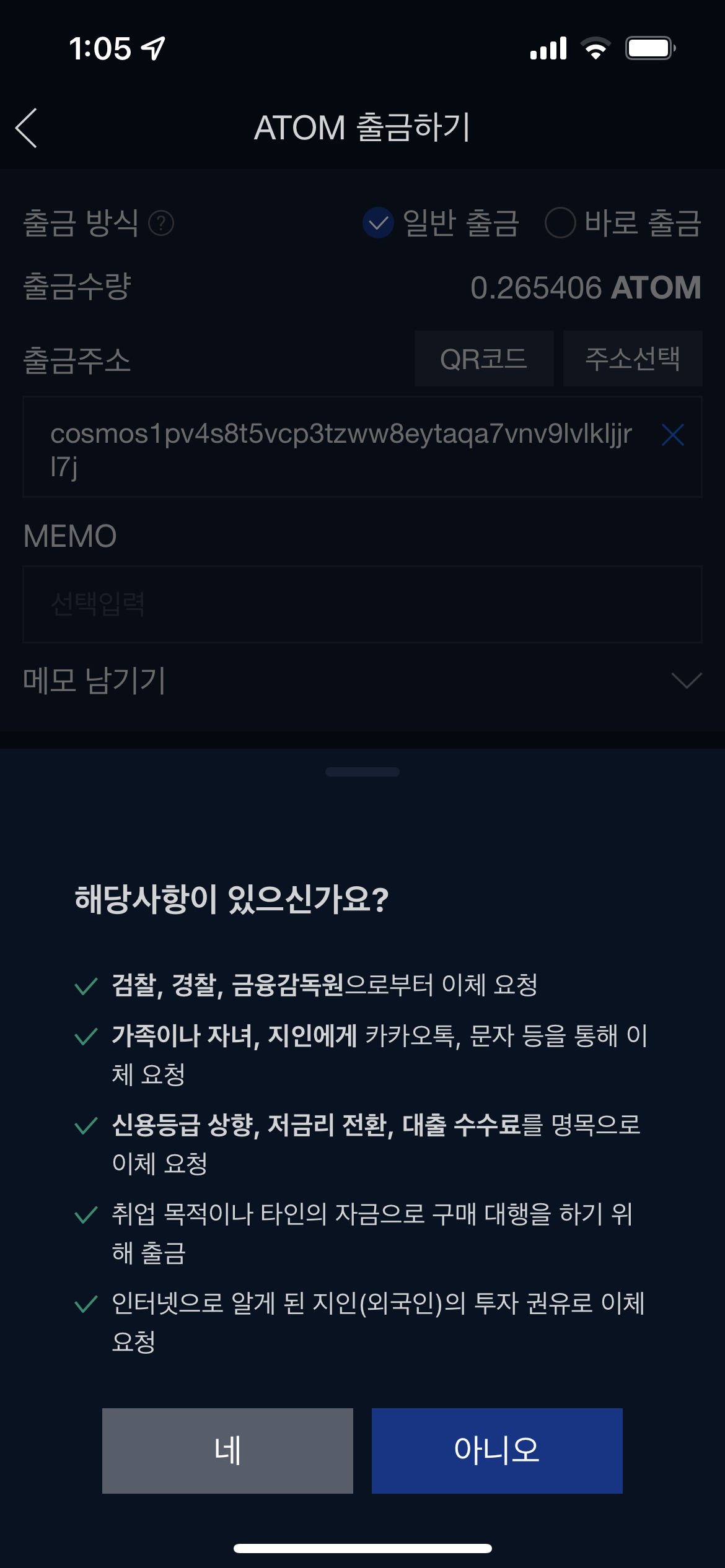 * 즉 원화 입금후 24시간이 지난후 ATOM 구매후 전송하면 된다.