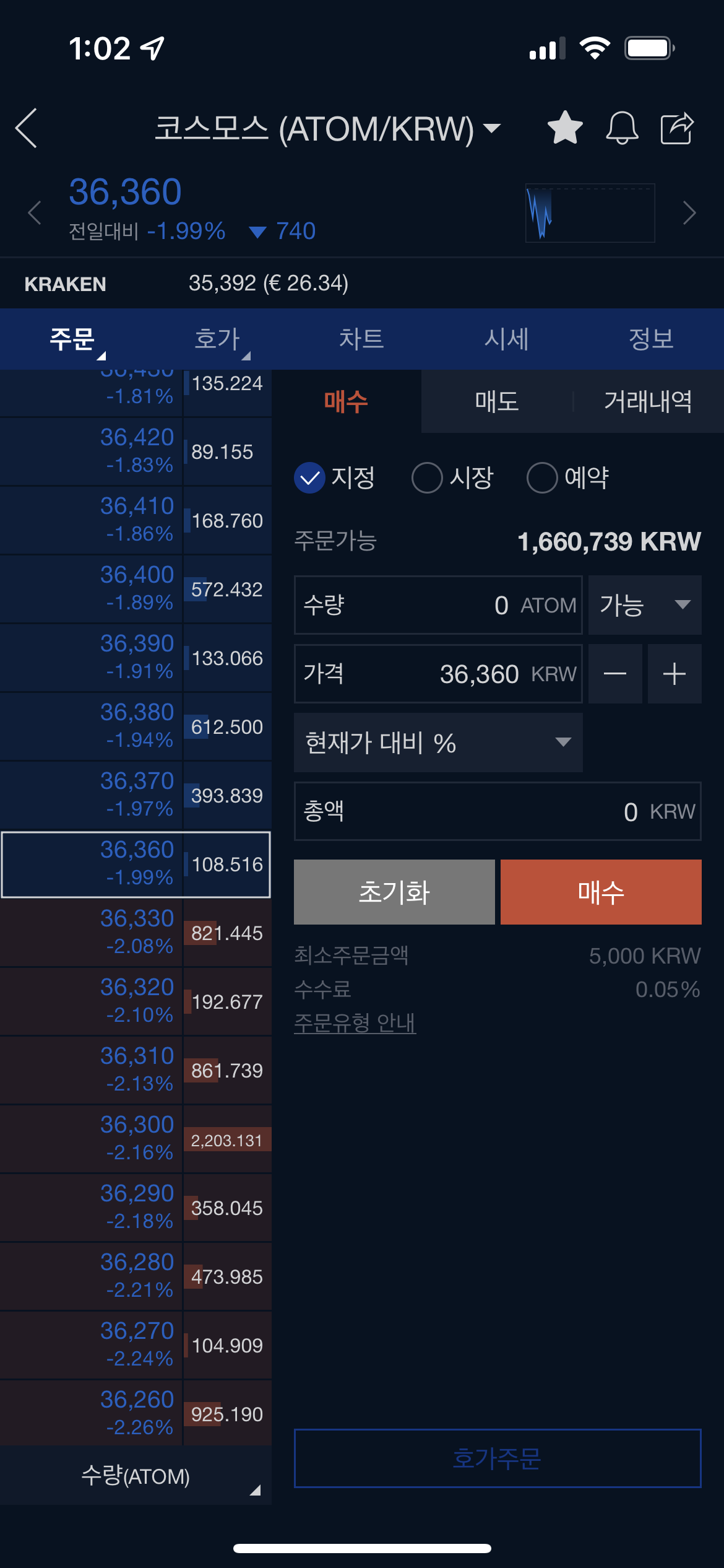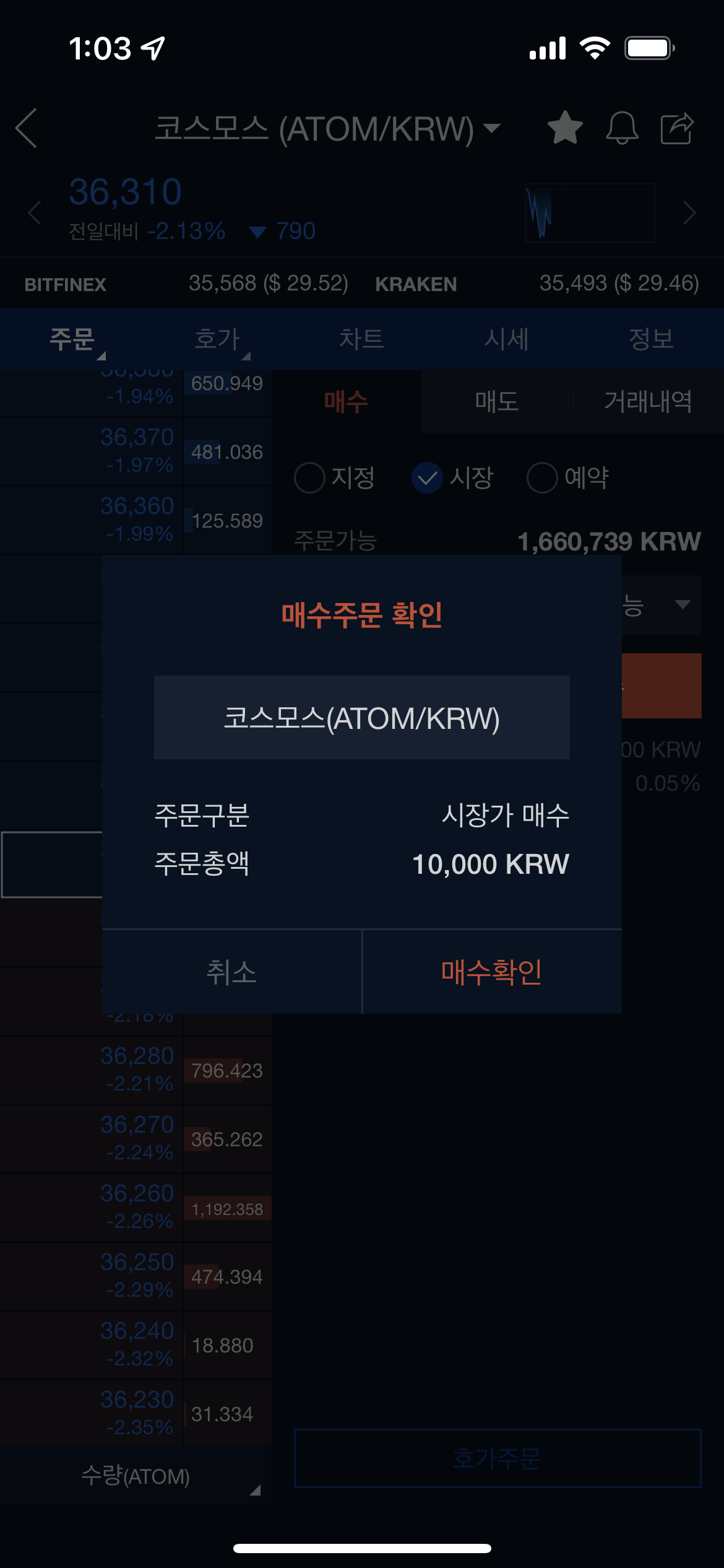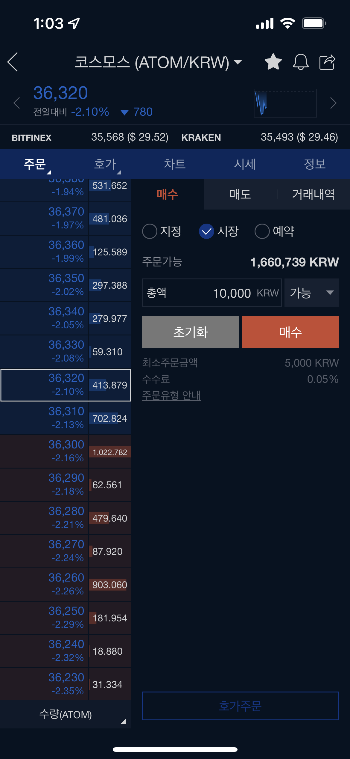 5.2 시장가 매수 (이 글을 쓰기 위해서 만원 투입!!!) 만원으로 코스모스 시장가 매수