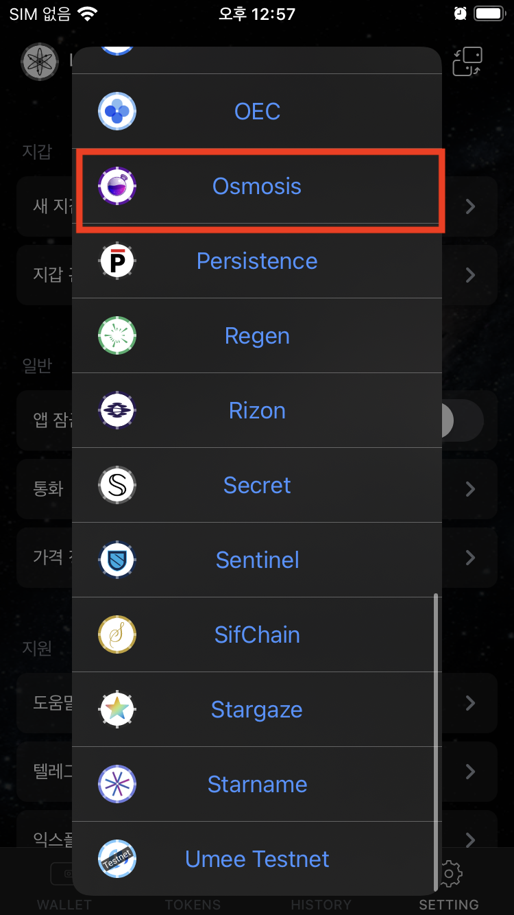 7.1 제일 상단에 지갑교환 선택 후 오스모시스 선택하기