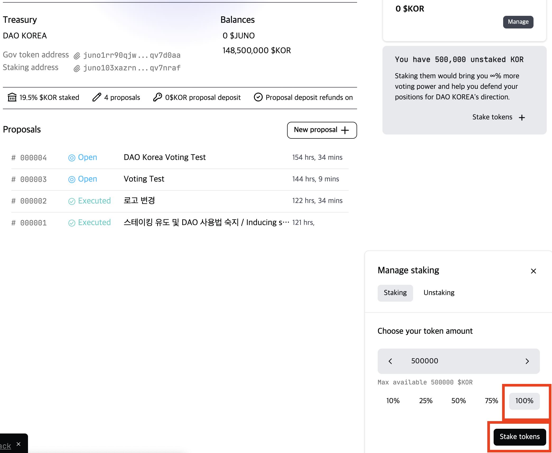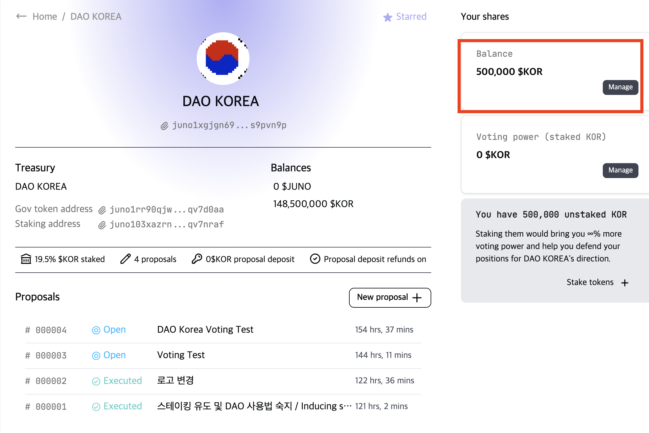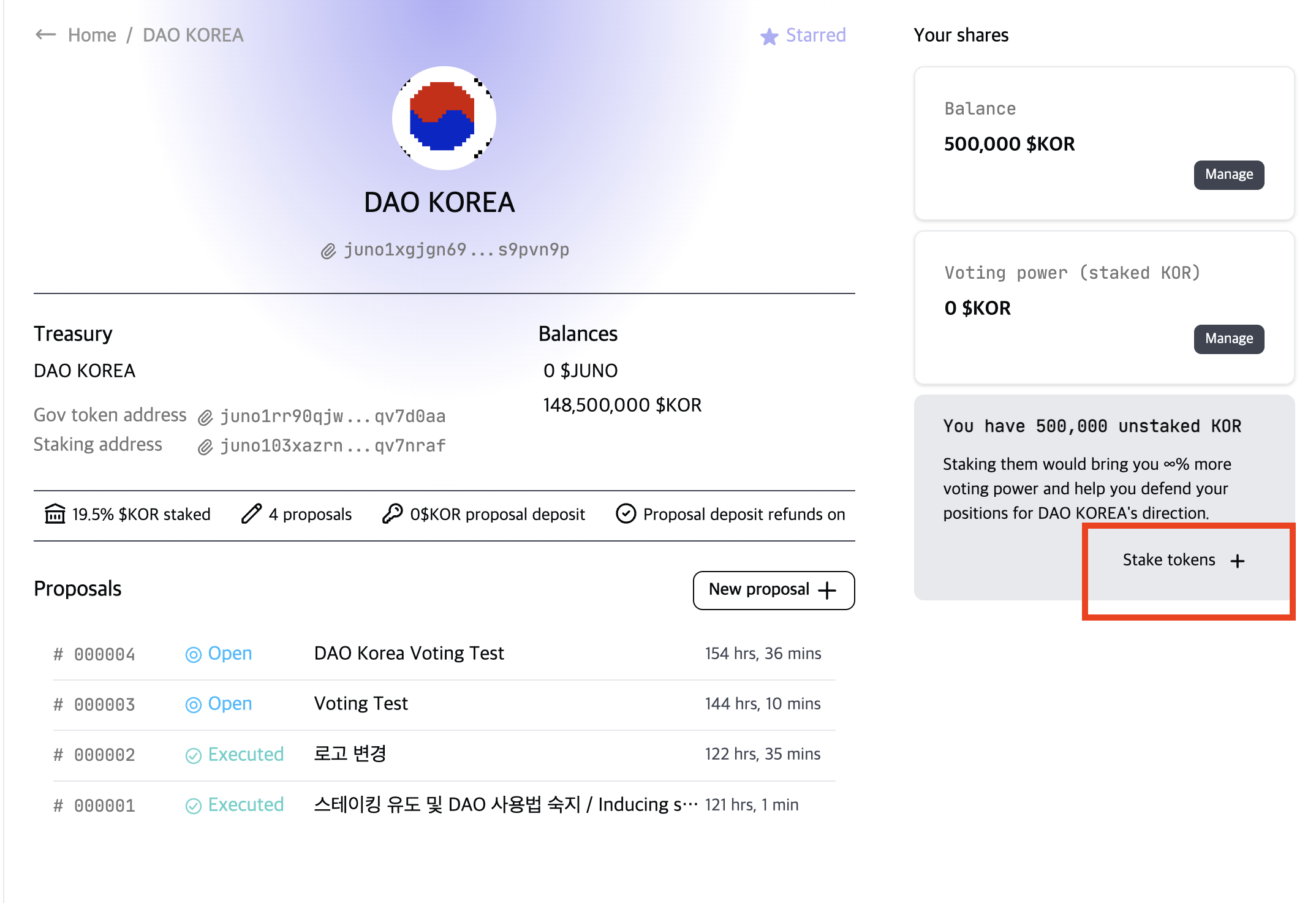 * 현재 DAO KOREA 컨트랙트에는 148,500,000 KOR 토큰이 예치되어 있습니다.