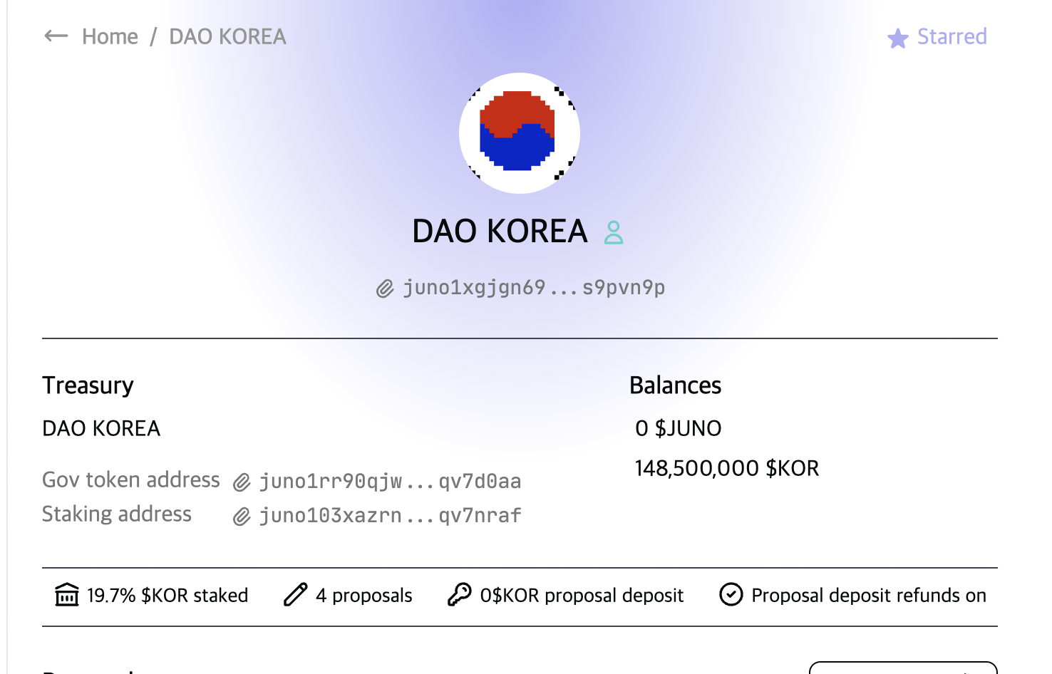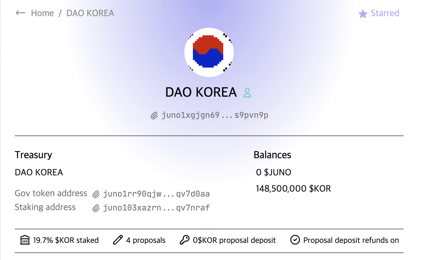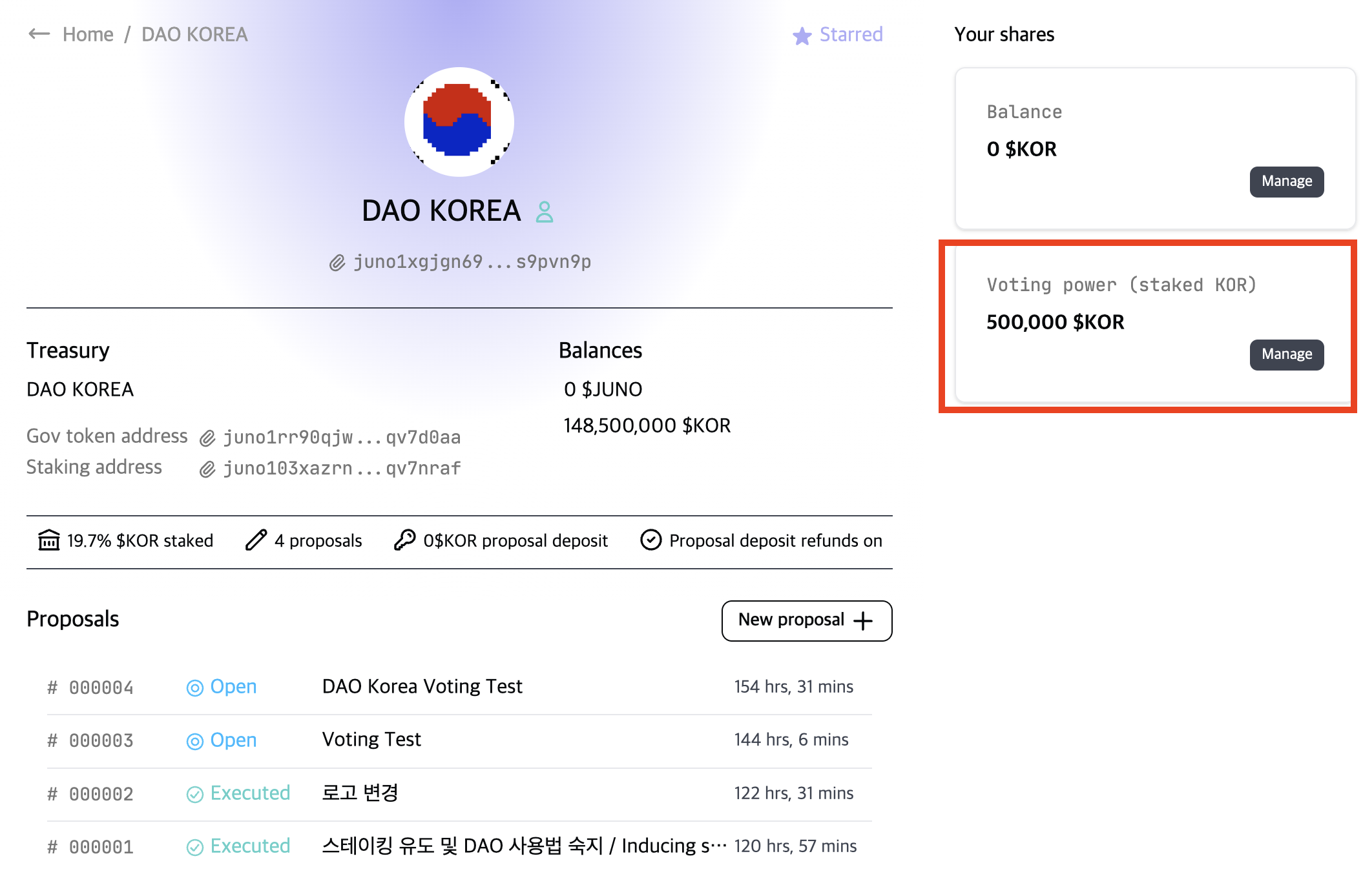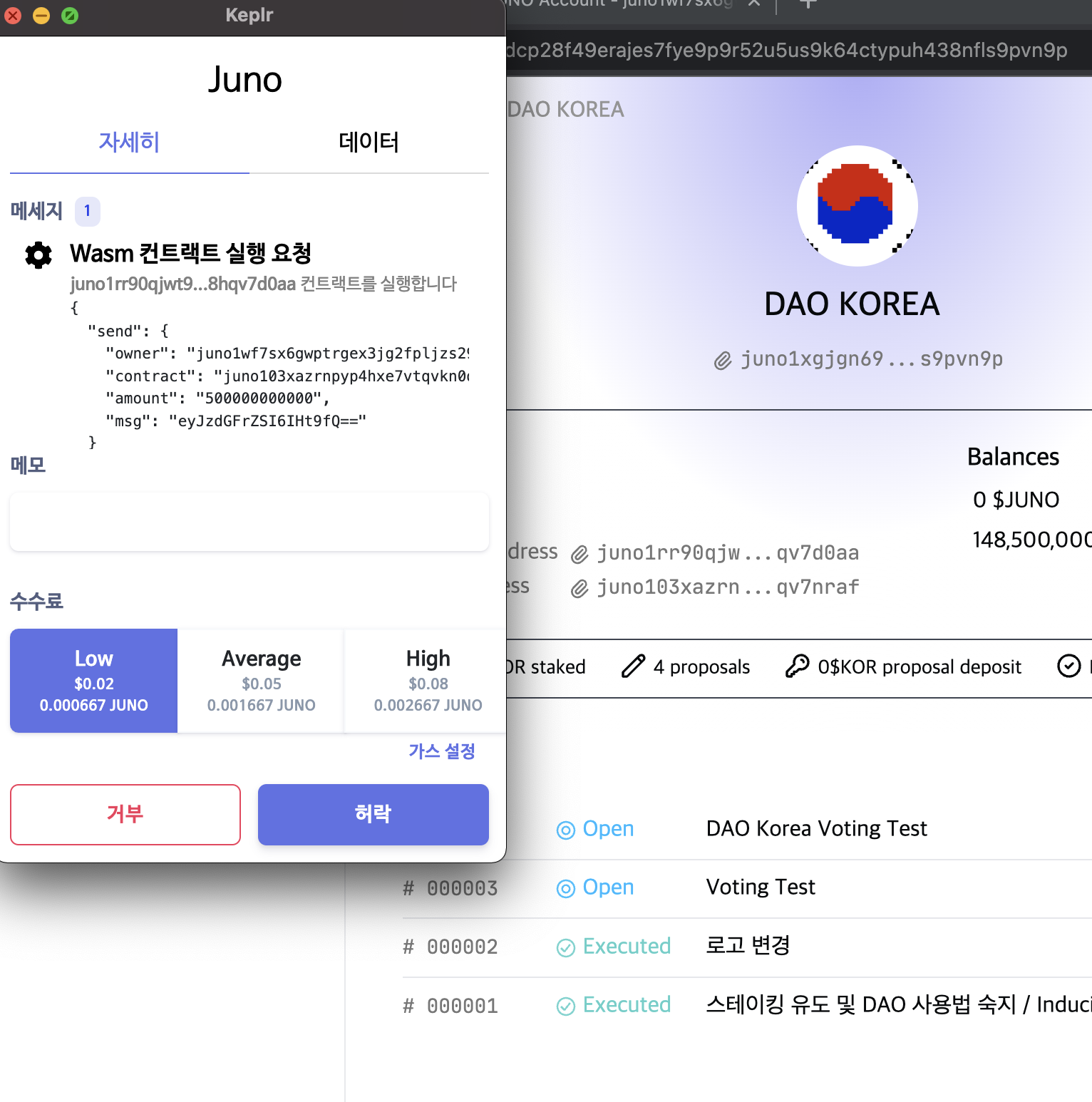 * 현재 DAO KOREA 컨트랙트에는 148,500,000 KOR 토큰이 예치되어 있습니다.