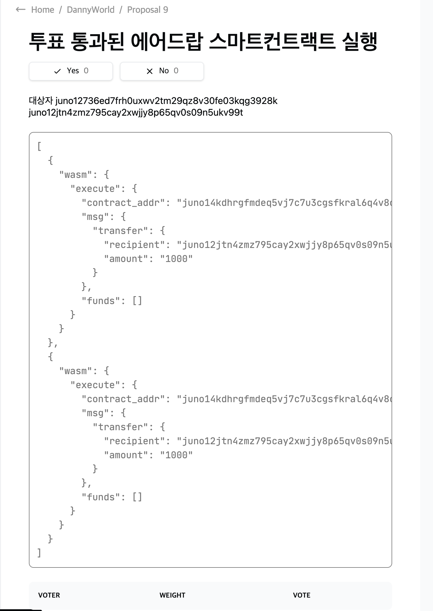 그러므로, 스마트컨트랙트 실행 제안의 경우 투표자들이 같이 꼼꼼하게 살펴볼 필요가 있습니다!!!