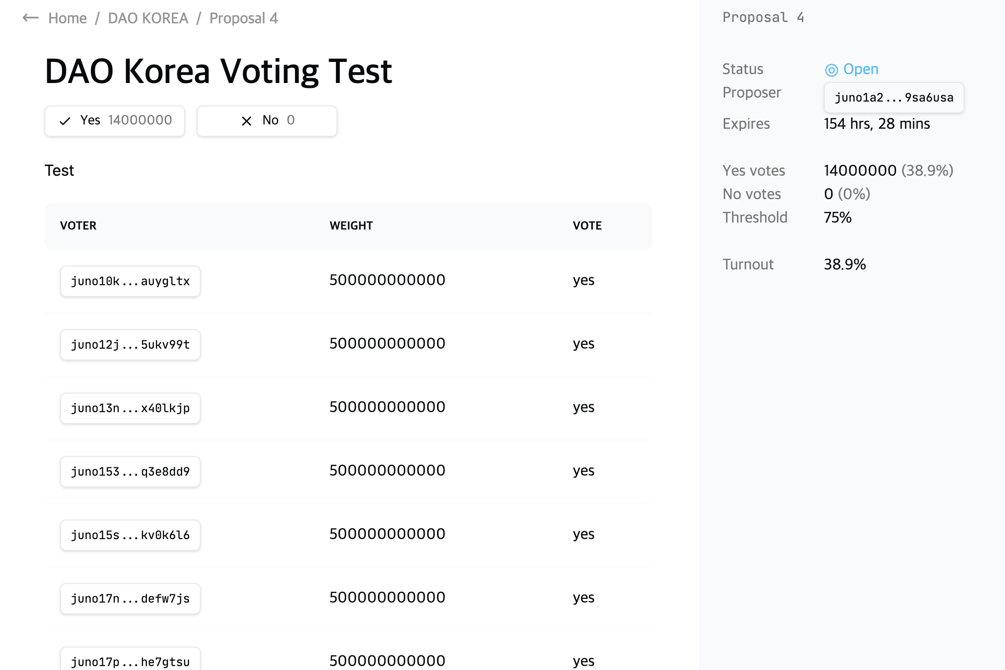 보팅파워의 75% 이상이 Yes로 투표하면 제안한 투표가 실행됩니다.