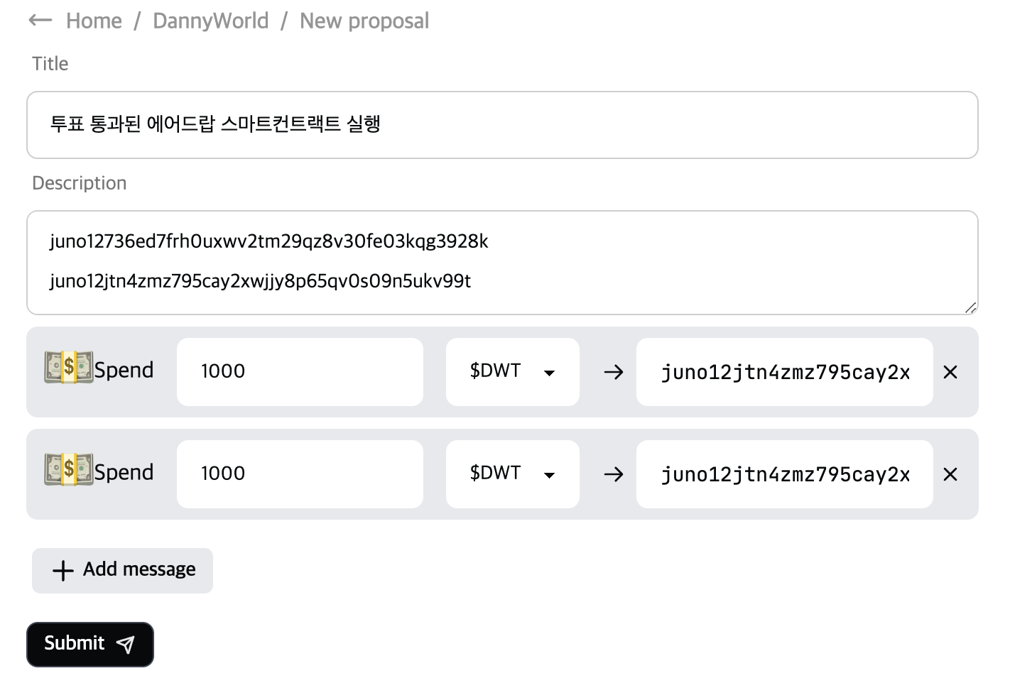 3.2. 투표 제안시 Spend를 클릭하면 Gov token을 특정주소로 보낼 수 있다.