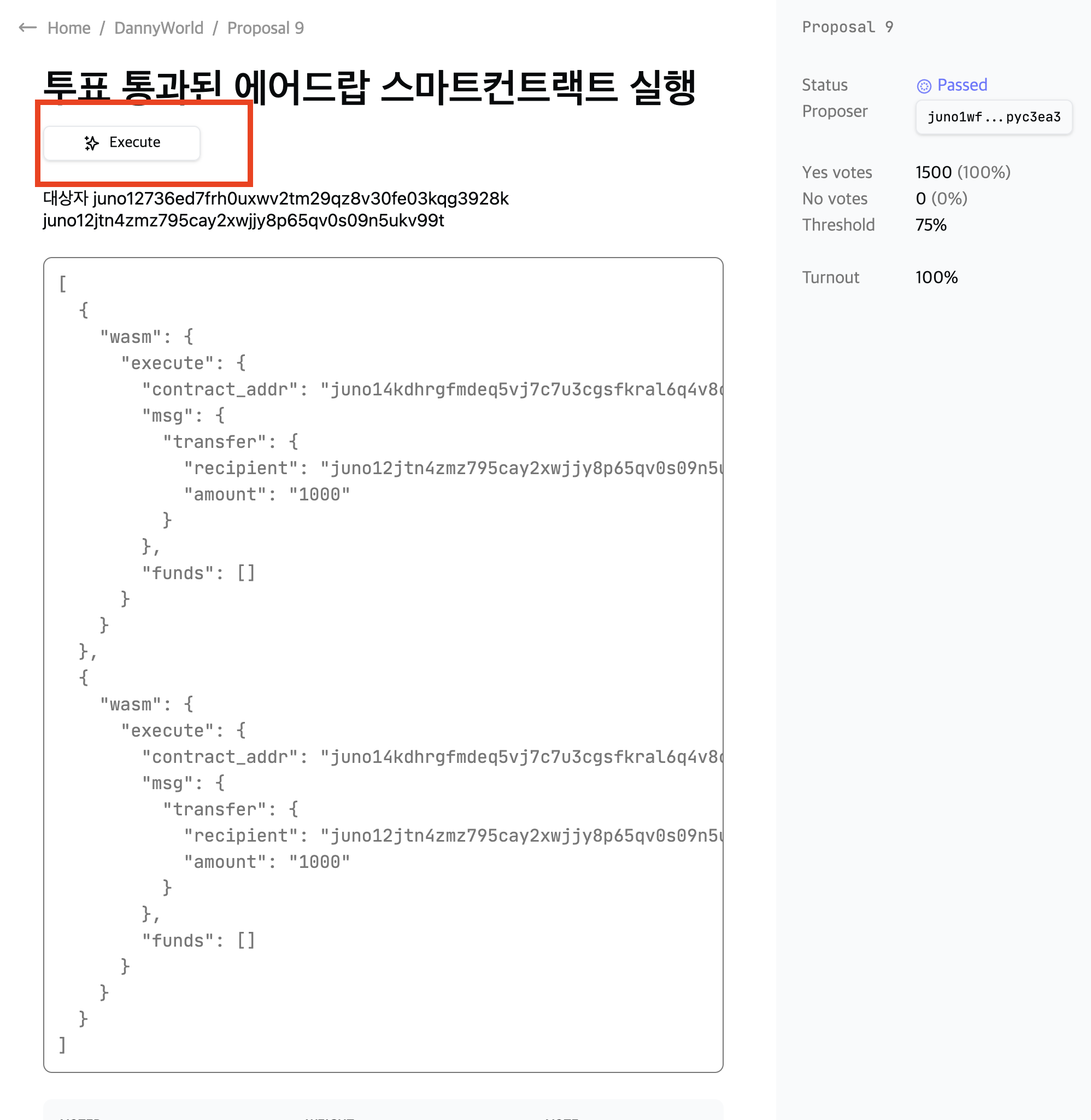 3.4 투표가 75%이상 Yes가 되면, 투표를 제안한 사람이 이 스마트컨트랙트를 실행할 수 있는 버튼이 생깁니다. (Execute)