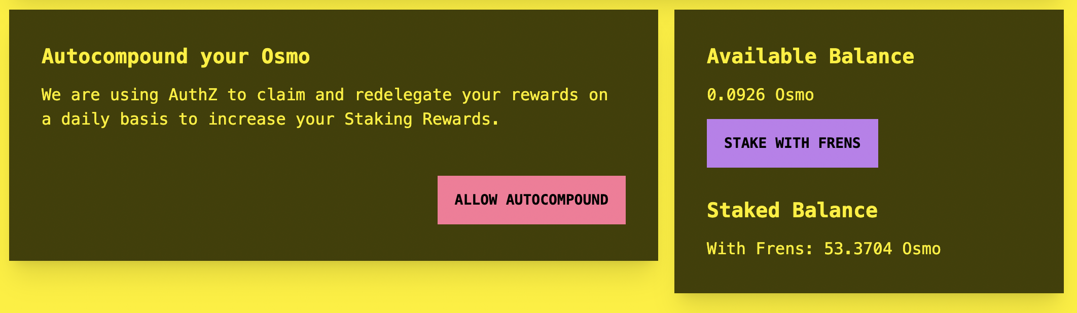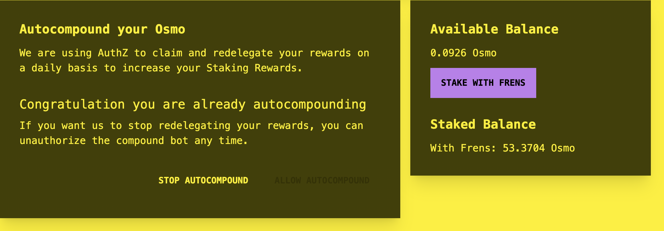 2. Allow Autocompound 클릭 (오른쪽 하단에 Frens에 스테이킹 되어 있어야 함.)