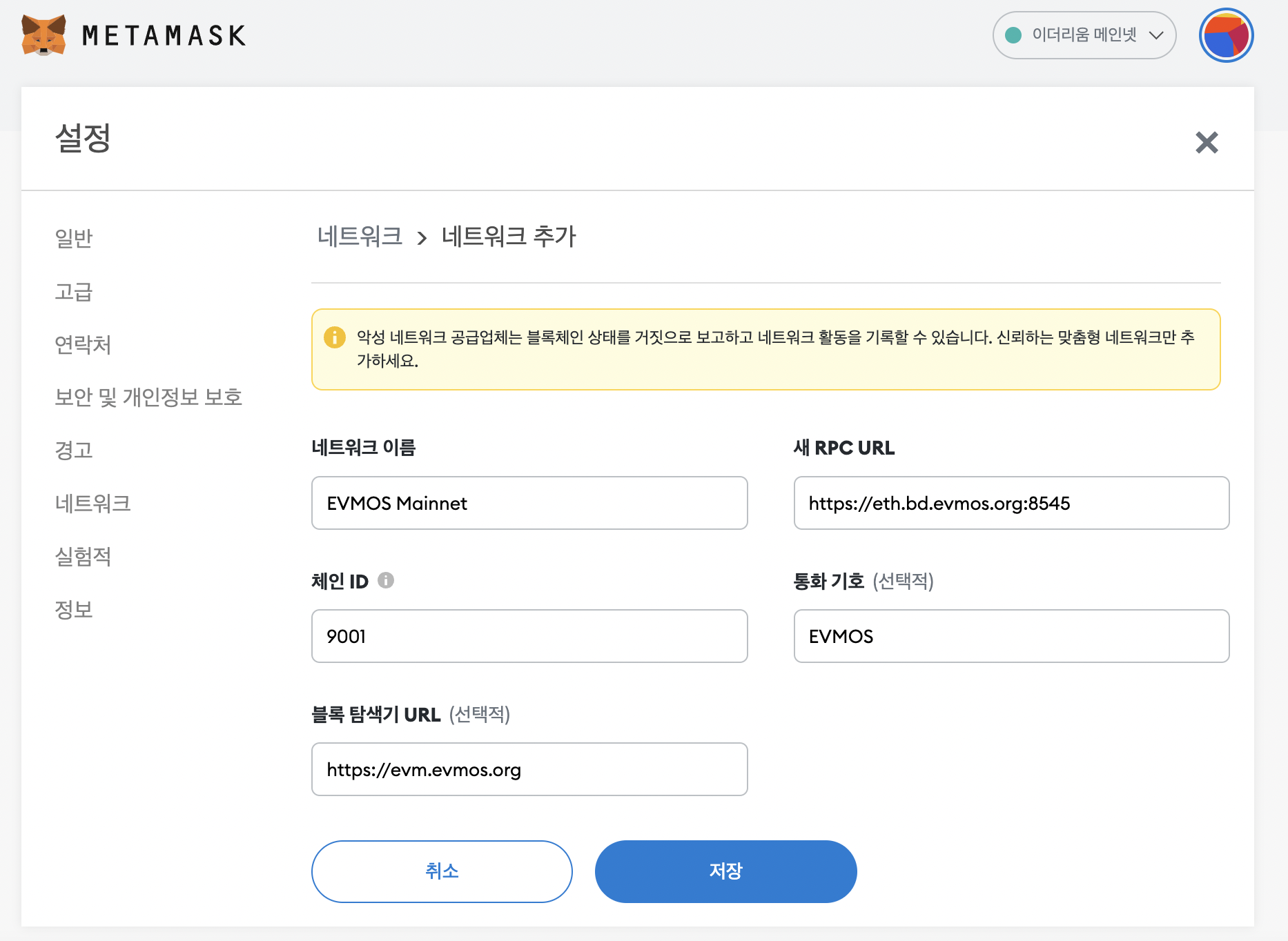 1. 메타마스크에 EVMOS 정보 추가.