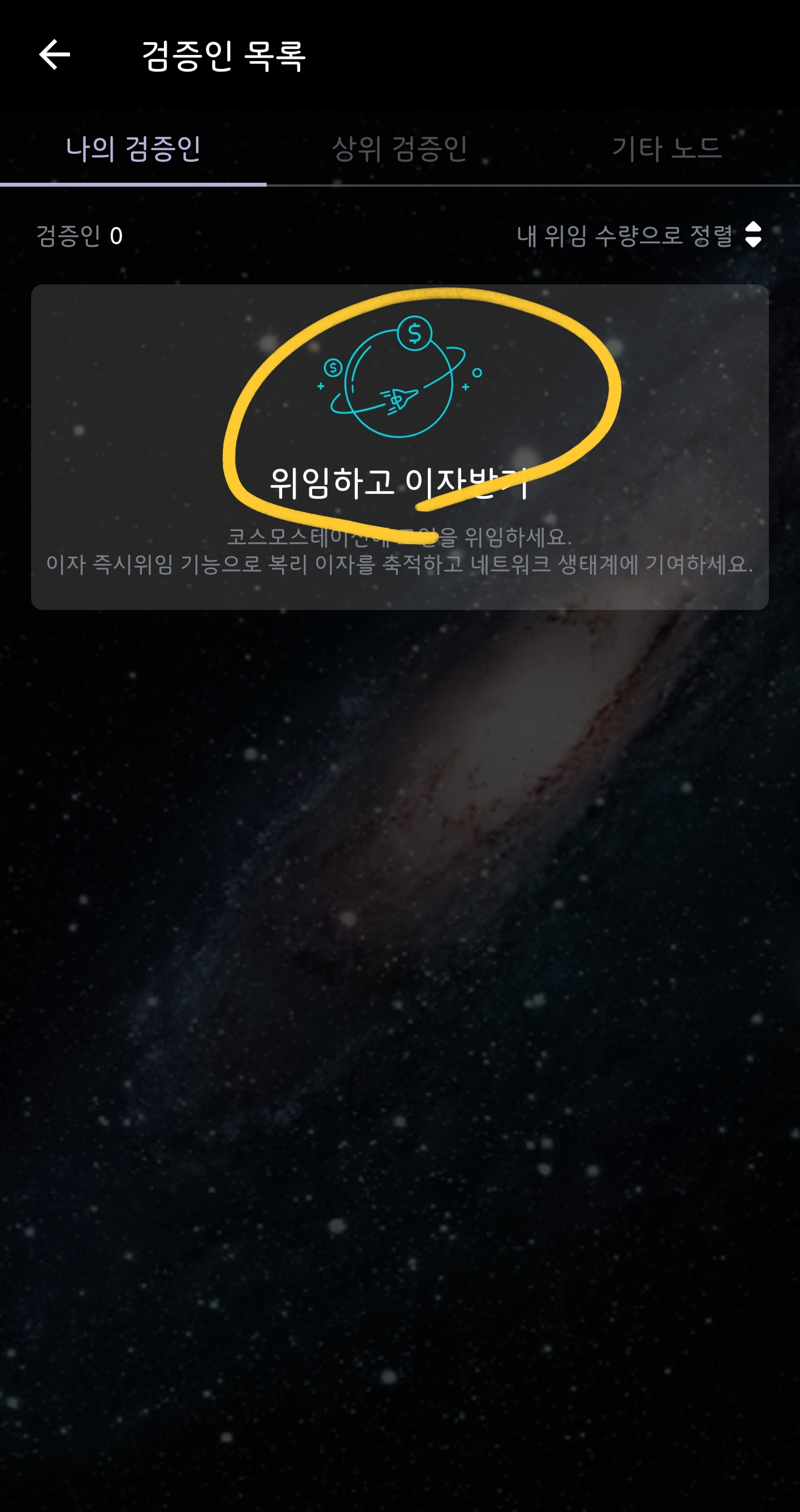 (아래 위임하고 이자받기를 클릭하면, 코스모스테이션에게 자동으로 위임됩니다.)