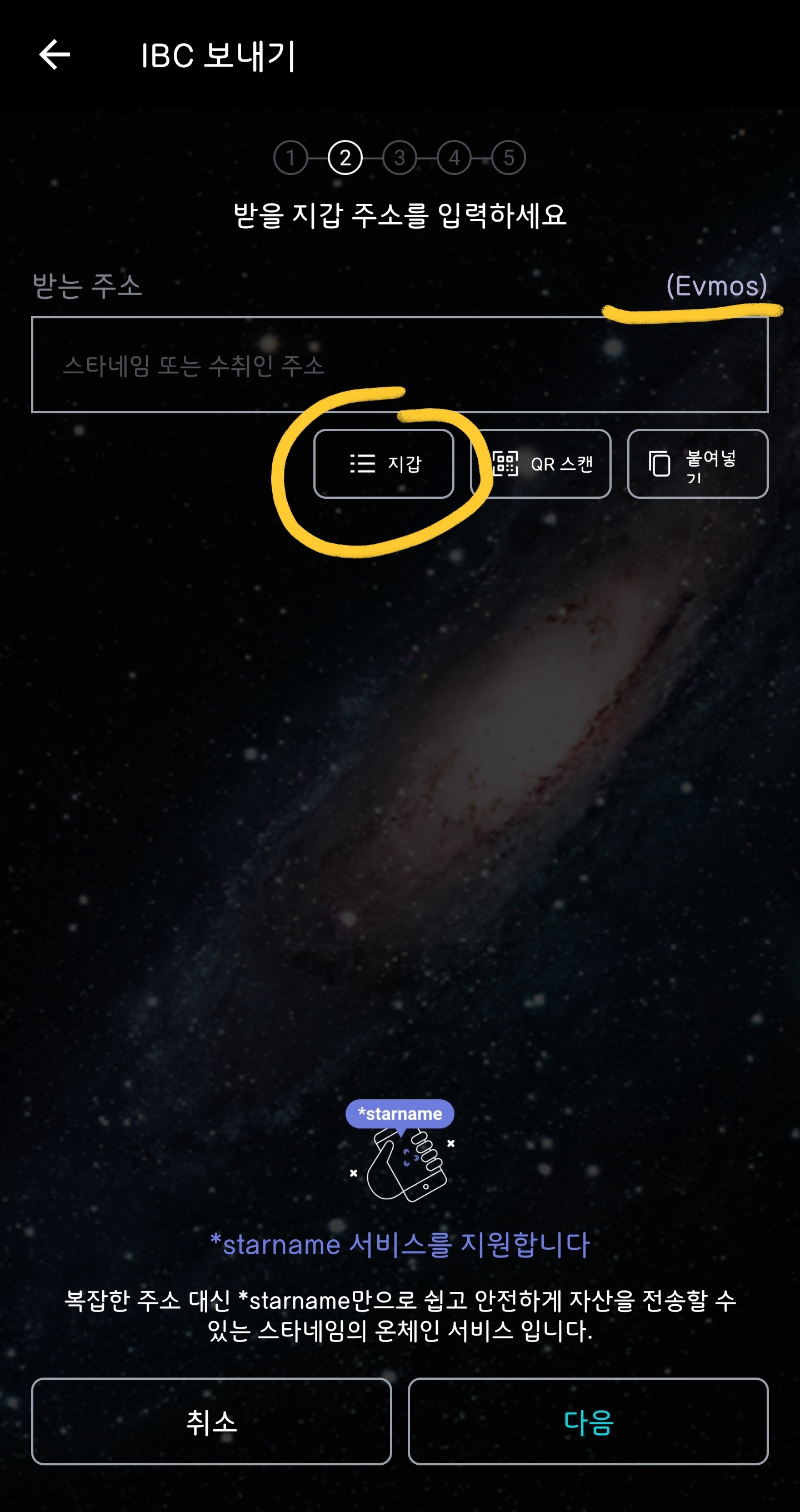 6. 받을 지갑 주소 입력(EVMOS 확인) - 지갑 선택