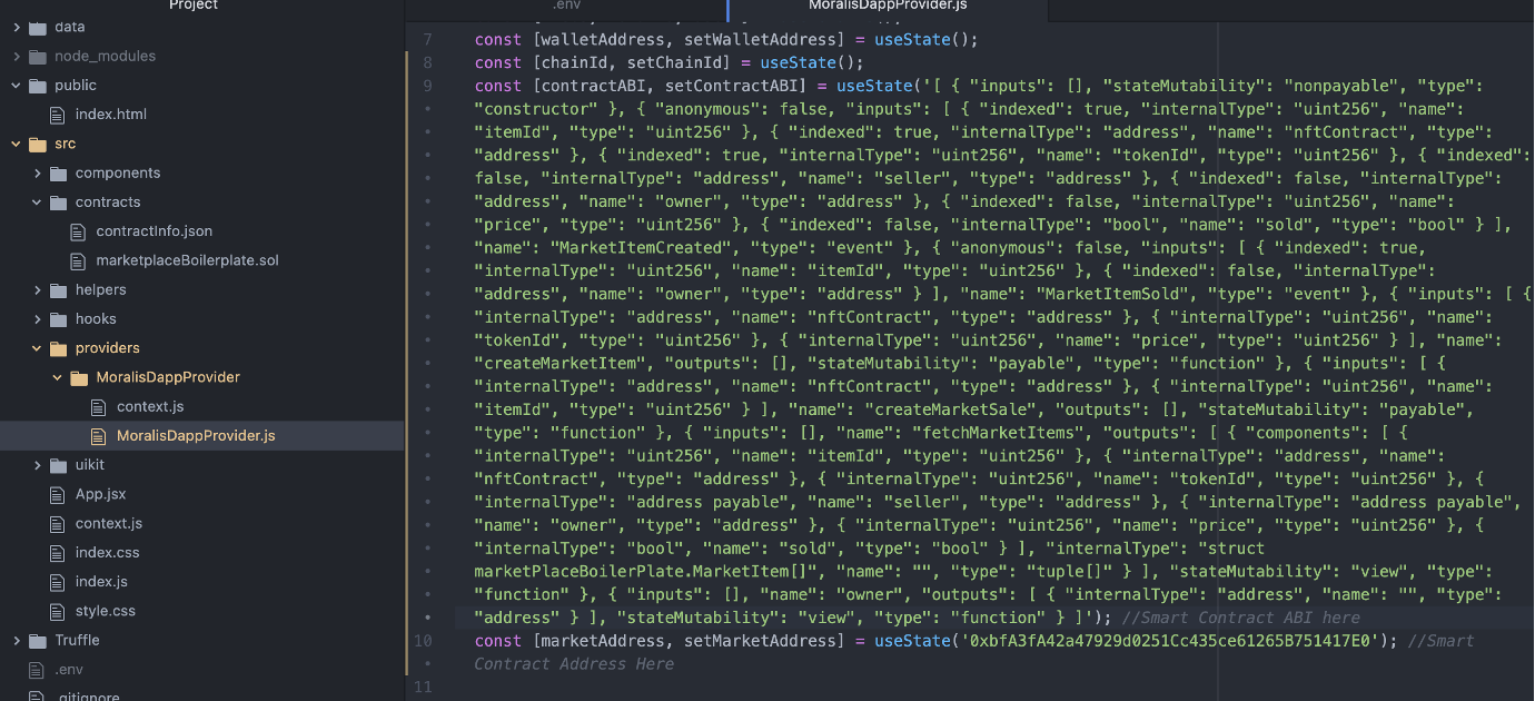 - 생성된 Contract를 아래 MoralisDappProvider.js에 붙여넣기.