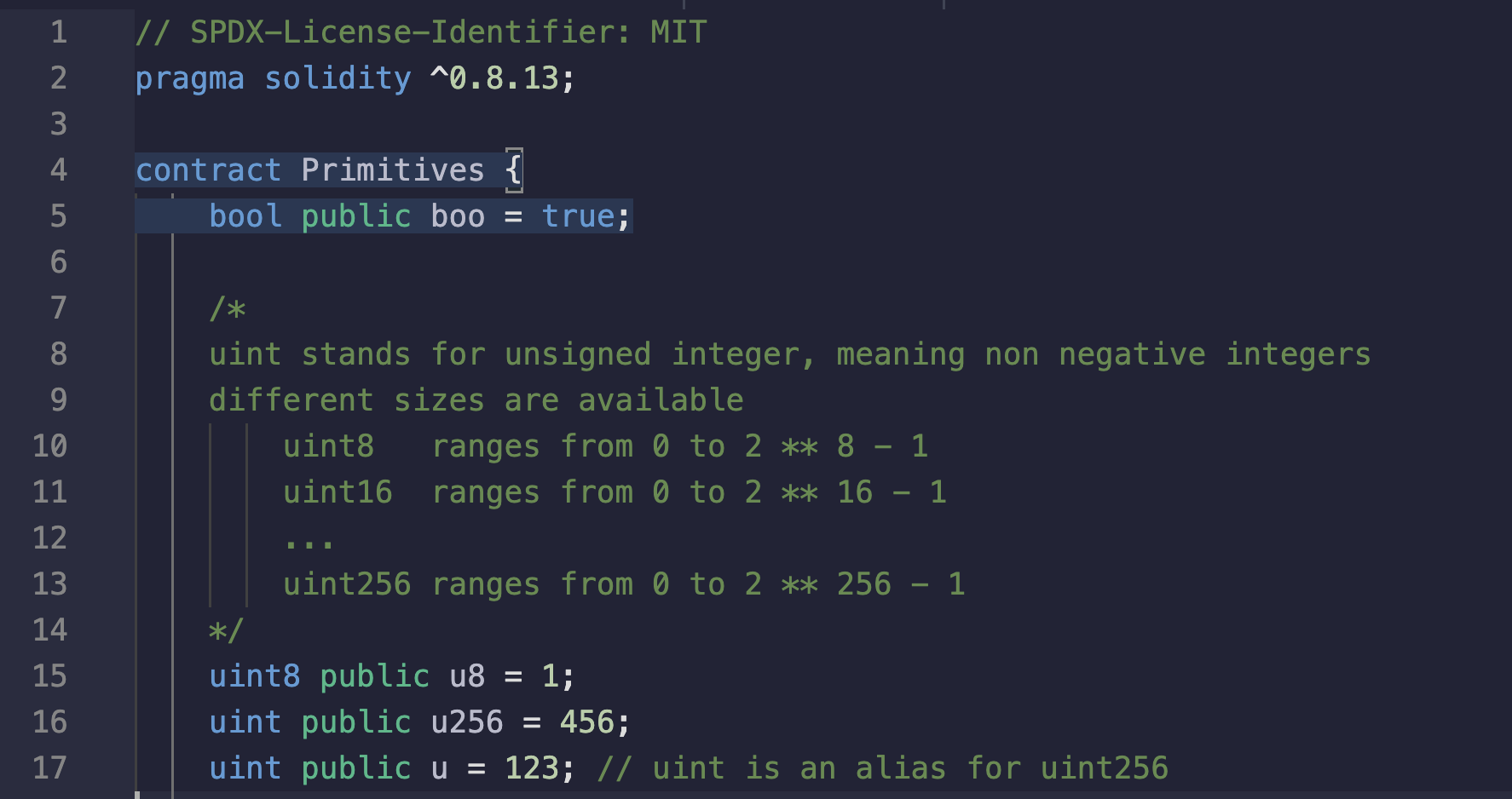 - Boolean, uint, int, address