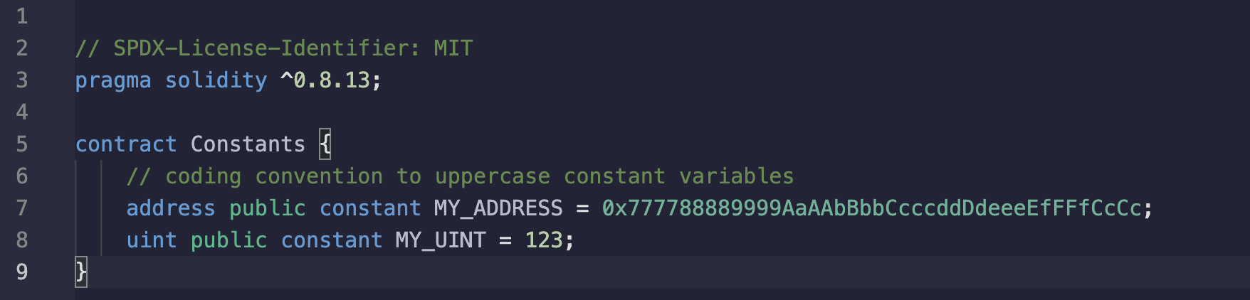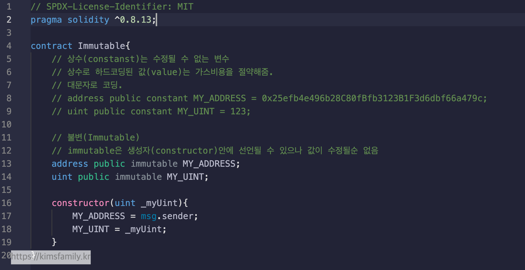 - constants로 하드 코딩된 값(value)은 가스 비용을 절약해 줌.