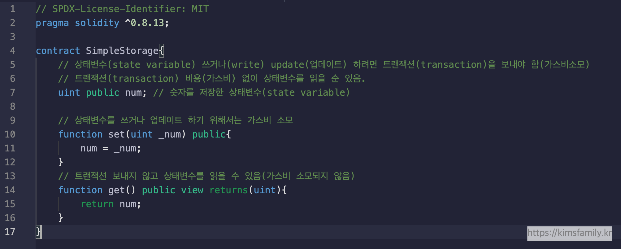 - 아래 예제의 마지막 함수 get()에서 view 속성을 부여하여(트랜잭션요청없이) num의 상태변수를 가스비 없이 읽을 수 있음.