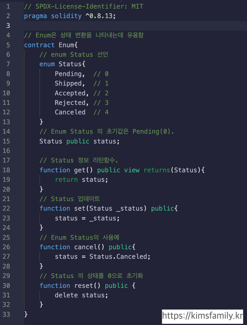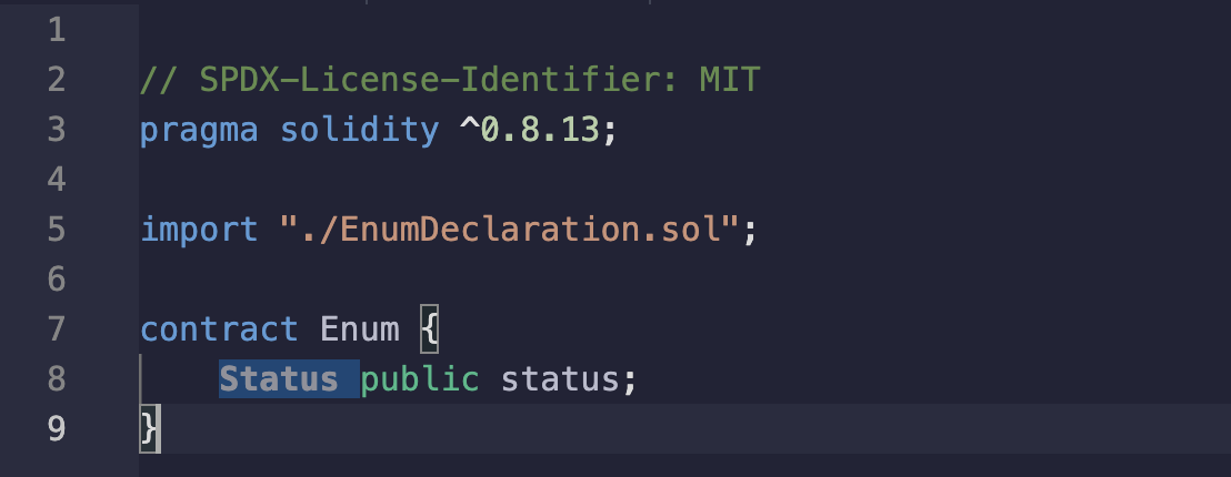 - import를 통해서 해당 enum 솔리디티 파일을 불러 온 후, 컨트랙트에서 선언된 Status enum 사용가능