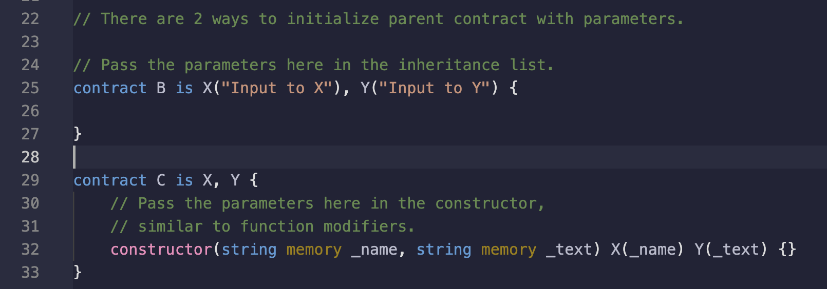 - 솔리디티는 다중상속을 지원함, 컨트랙트는 is 키워드를 사용하여 다른 컨트랙트를 상속할 수 있음