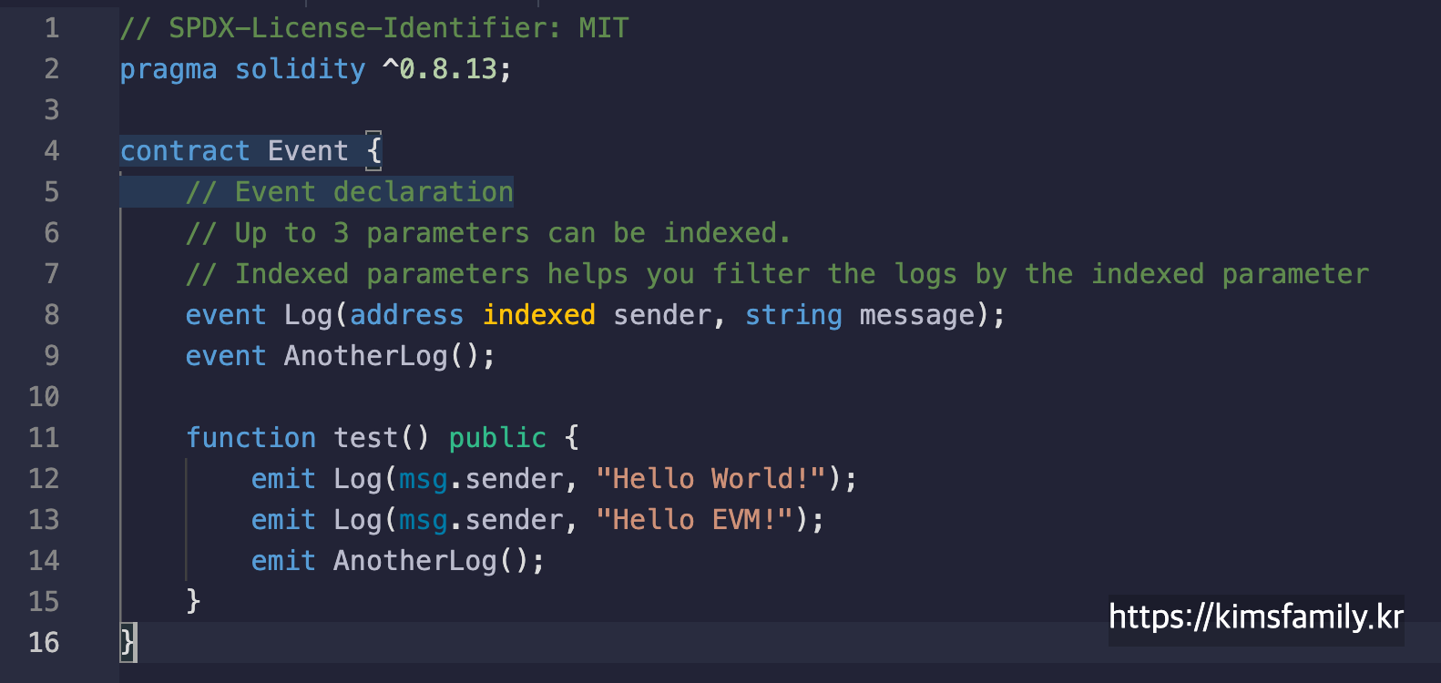 - 아래 예제에서, indexed 로 선언된 매개변수는 향후에 해당 로그를 찾아서 사용하는데 유용함