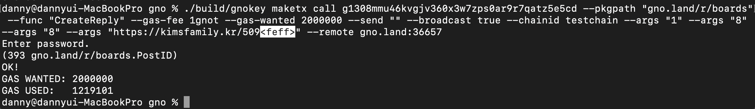 ./build/gnokey maketx call g1308mmu46kvgjv360x3w7zps0ar9r7qatz5e5cd --pkgpath "gno.land/r/boards" --func "CreateReply" --gas-fee 1gnot --gas-wanted 2000000 --send "" --broadcast true --chainid testchain --args "1" --args "8" --args "8" --args "https://kimsfamily.kr/509" --remote gno.land:36657