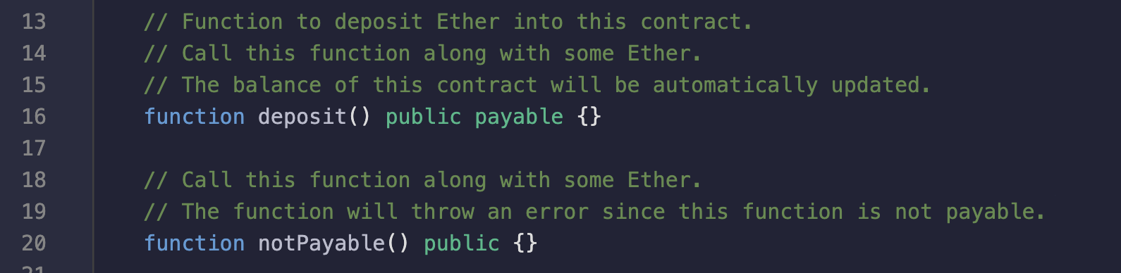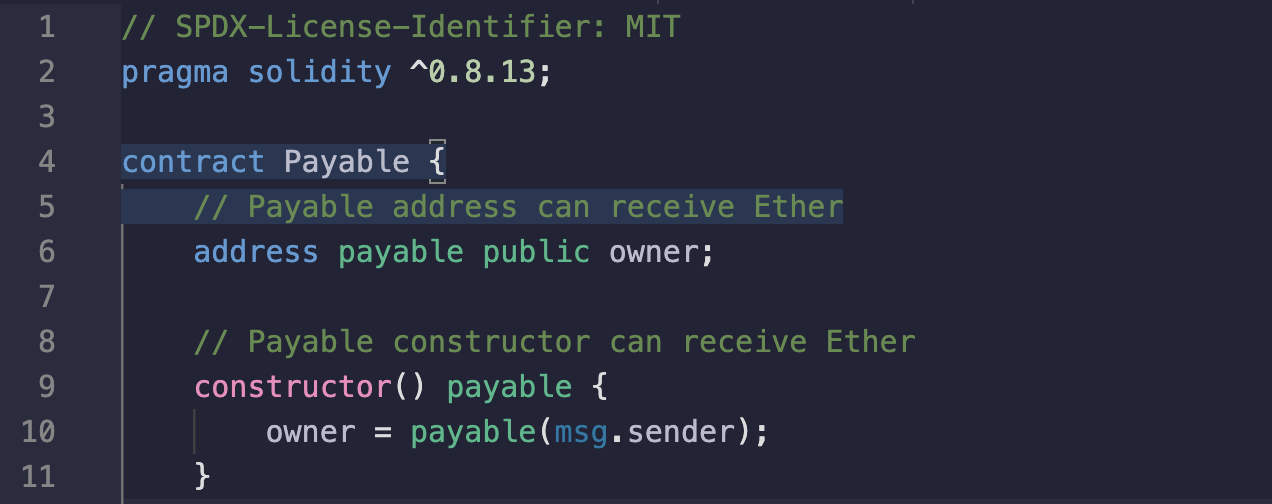 - 함수와 주소(address)는 payable 키워드를 사용하여 ether를 받을 수 있음.