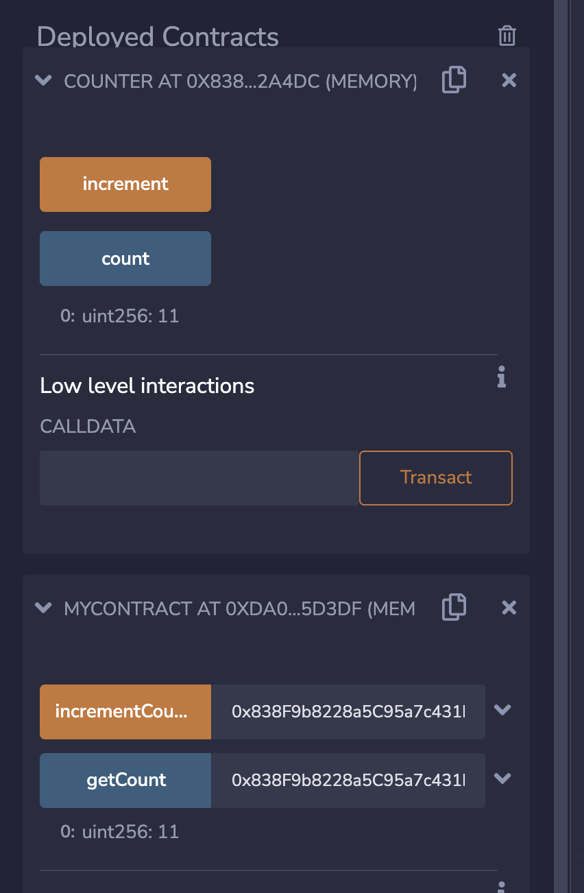 - Deploy후, 카운터 컨트랙트를 Mycontract에서 접근하여 Counter 컨트랙트 활용가능.