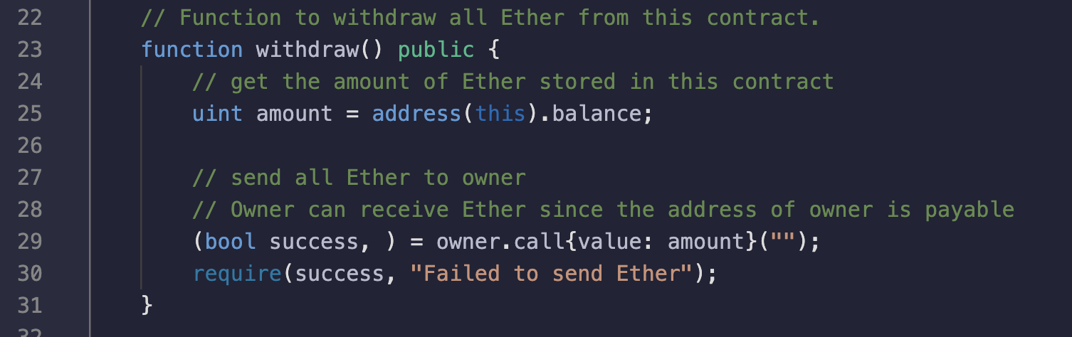 2.3 withdraw()함수는 현재 이 컨트랙트에 있는 모든 balance(이더)를 인출할 수 있음