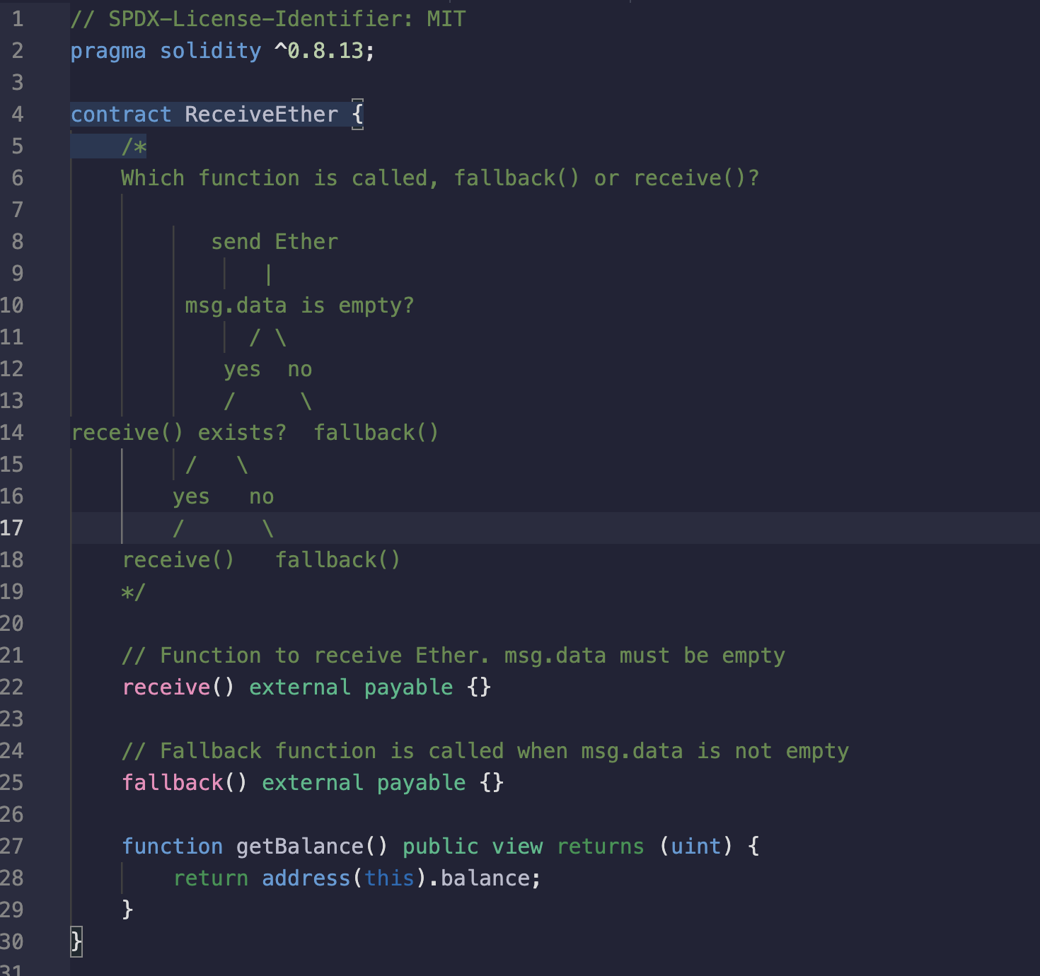 - receive()의 경우는 msg.data, 즉 calldata가 비어있는 경우 사용되고, 다른 경우에는 fallback() 함수를 호출하면 됨.