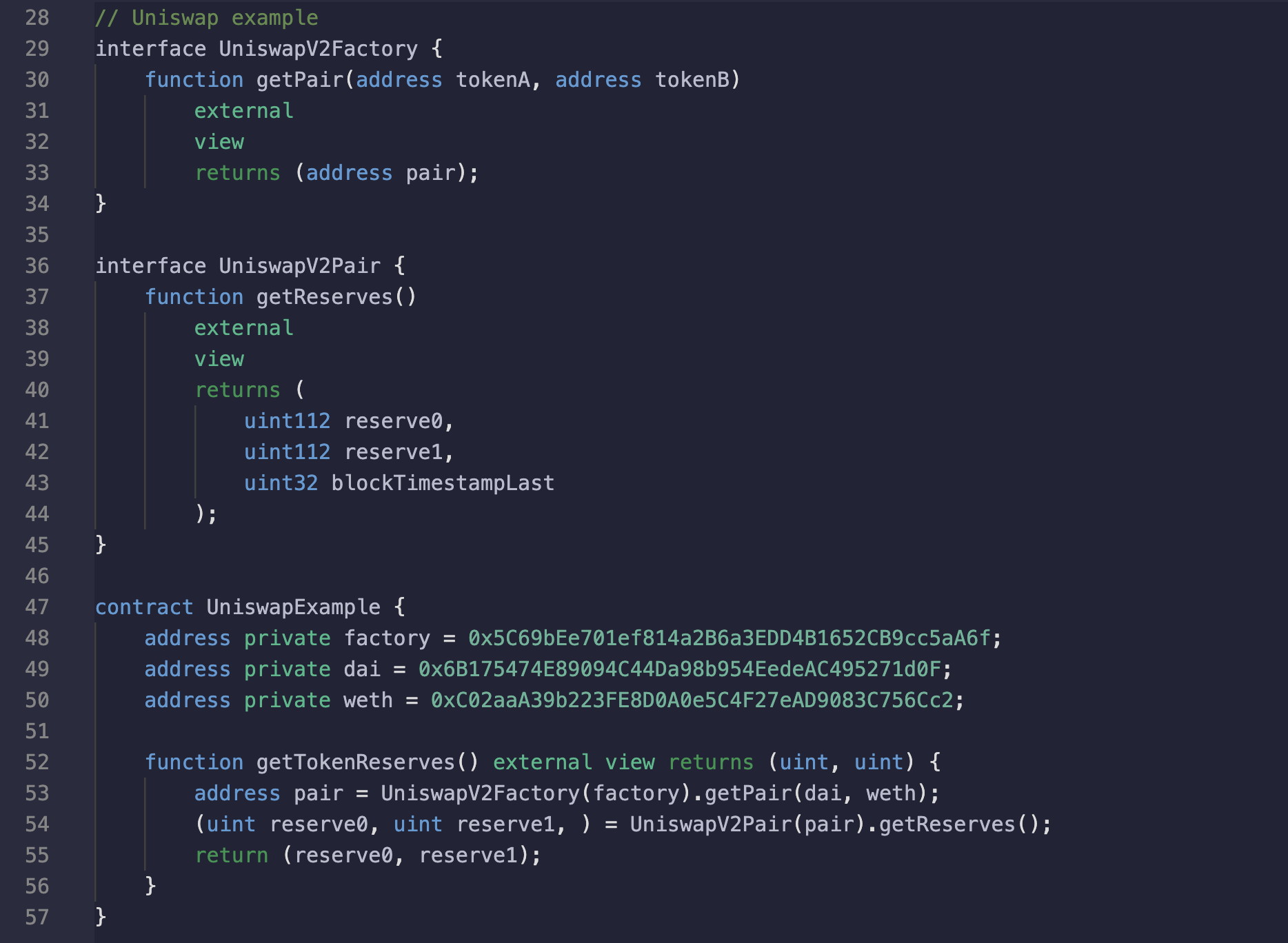- UniswapV2Factory 및 UniswapV2Pari 인터페이스 선언 후, uniswap의 컨트랙트를 사용하여 getTokenReserves() 사용.