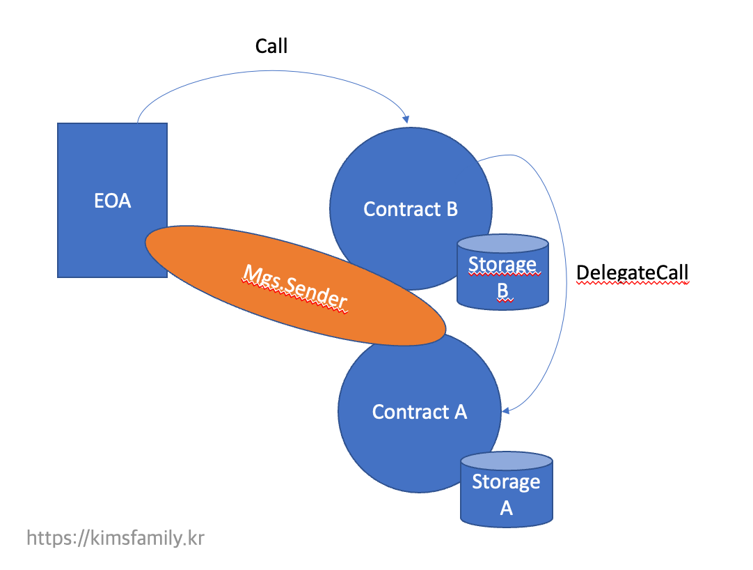 - 컨트랙트 B의 코드가 컨트랙트 A의 스토리지(storage), msg.sender, msg.value를 통해서 실행됨