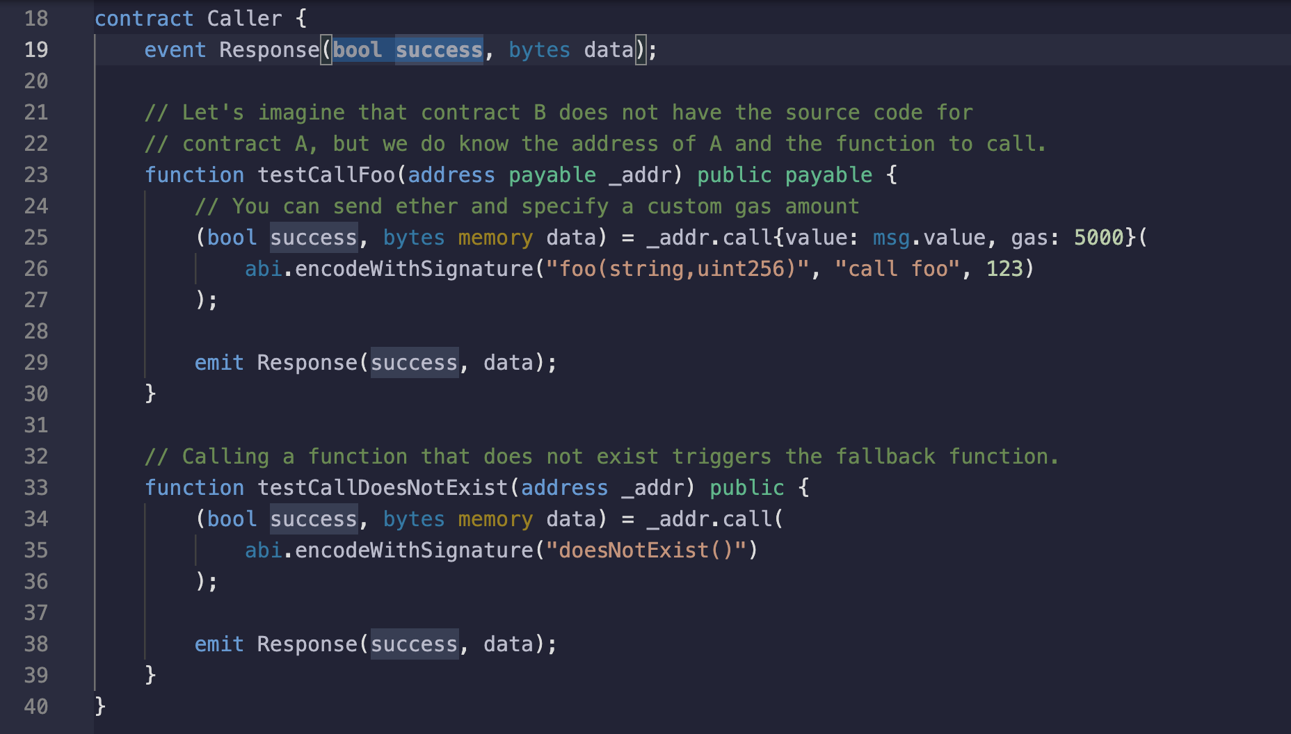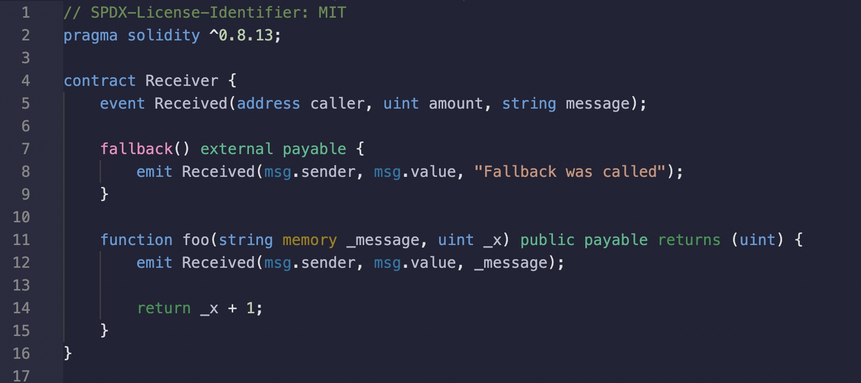 - Caller 컨트랙트는 call을 사용하여 Receiver 컨트랙트의 함수를 호출.