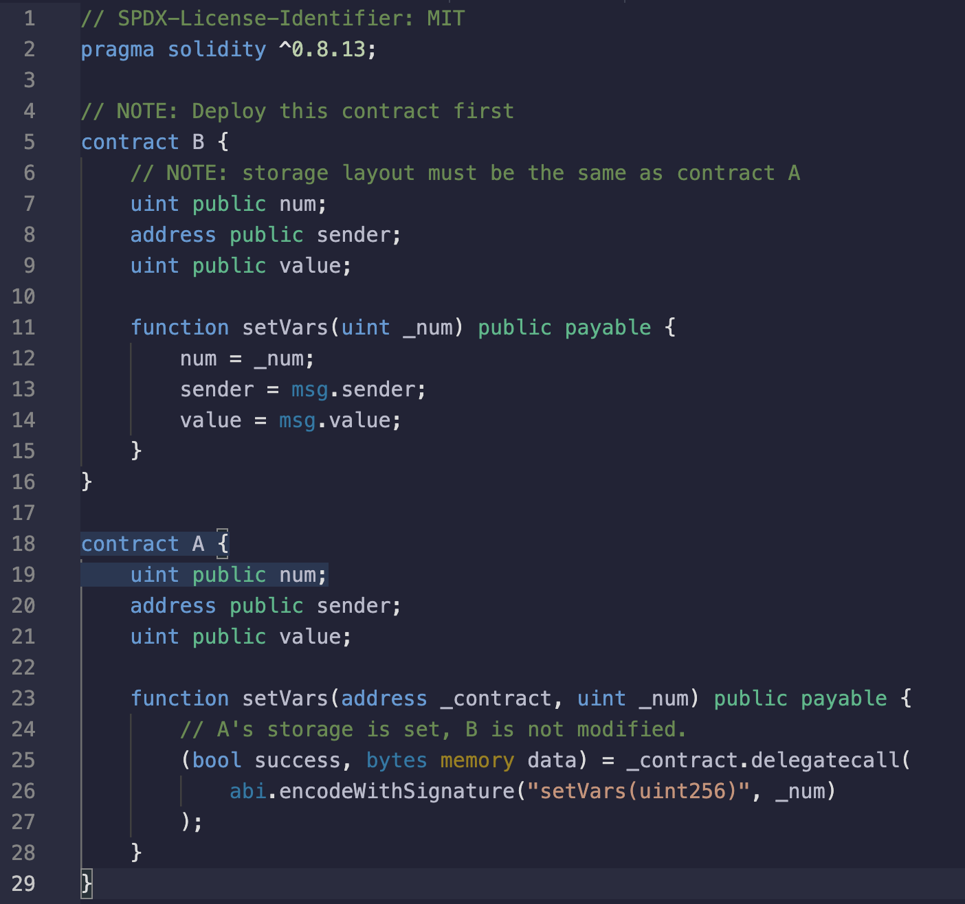 - 아래 예제에서 B를 먼저 실행후 A에서 delegatecall을 사용한다.